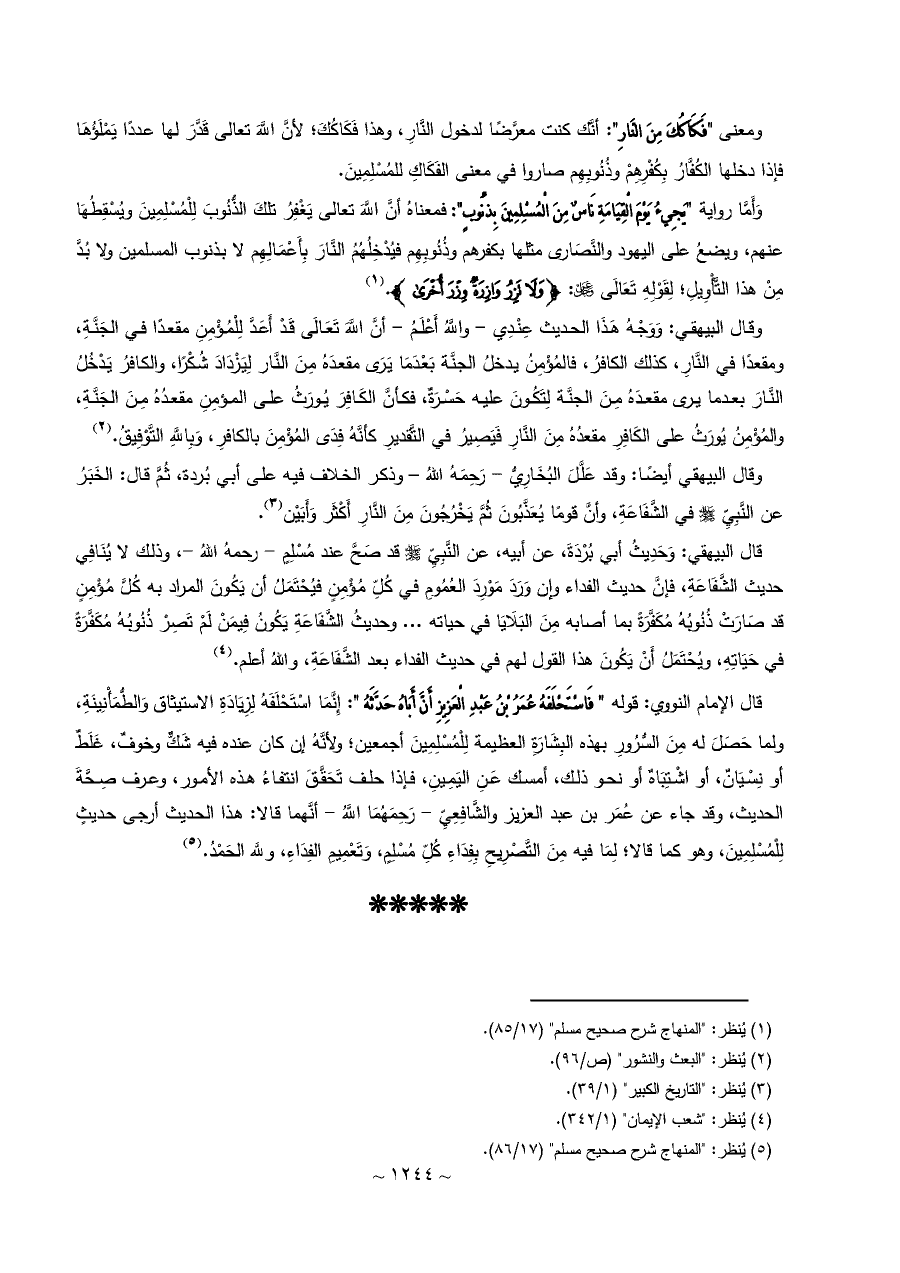 وَأَمَّا رواية "يَجِيءُ يَوْمَ الْقِيَامَةِ نَاسٌ مِنَ الْمُسْلِمِينَ بِذُنُوبٍ": فمعناهُ أنَّ اللَّهَ تعالى يَغْفِرُ تلكَ الذُّنُوبَ لِلْمُسْلِمِينَ ويُسْقِطُهَا عنهم، ويضعُ على اليهود والنَّصَارى مثلها بكفرهم وذُنُوبِهِم فيُدْخِلُهُمُ النَّارَ بِأَعْمَالِهِم لا بذنوب المسلمين ولا بُدَّ مِنْ هذا التَّأْوِيلِ؛ لِقَوْلِهِ تَعَالَى - عز وجل -: {وَلَا تَزِرُ وَازِرَةٌ وِزْرَ أُخْرَى}. (¬١)