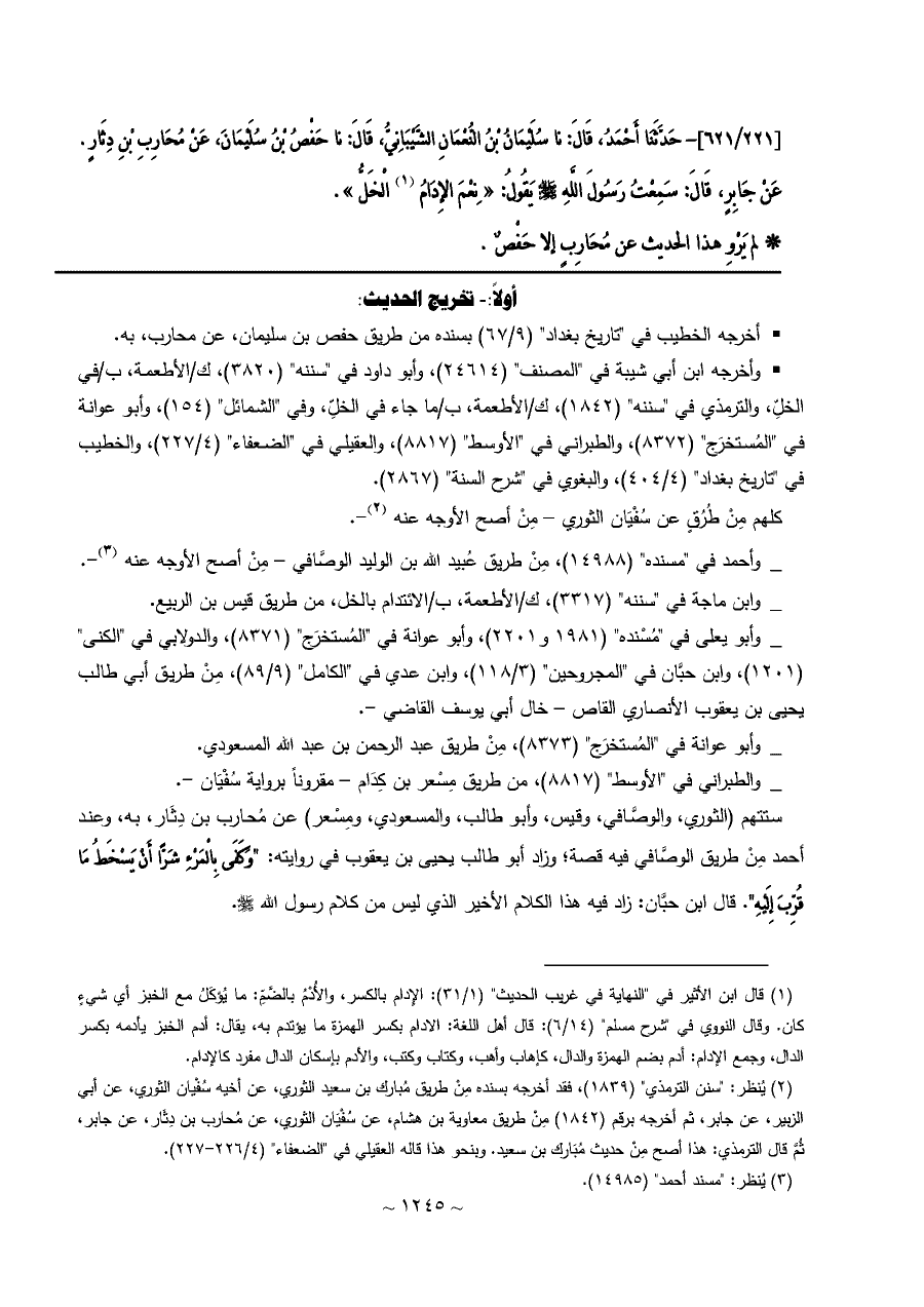 [٢٢١/ ٦٢١]- حَدَّثَنَا أَحْمَدُ، قَالَ: نا سُلَيْمَانُ بْنُ النُّعْمَانِ الشَّيْبَانِيُّ، قَالَ: نا حَفْصُ بْنُ سُلَيْمَانَ، عَنْ مُحَارِبِ بْنِ دِثَارٍ.