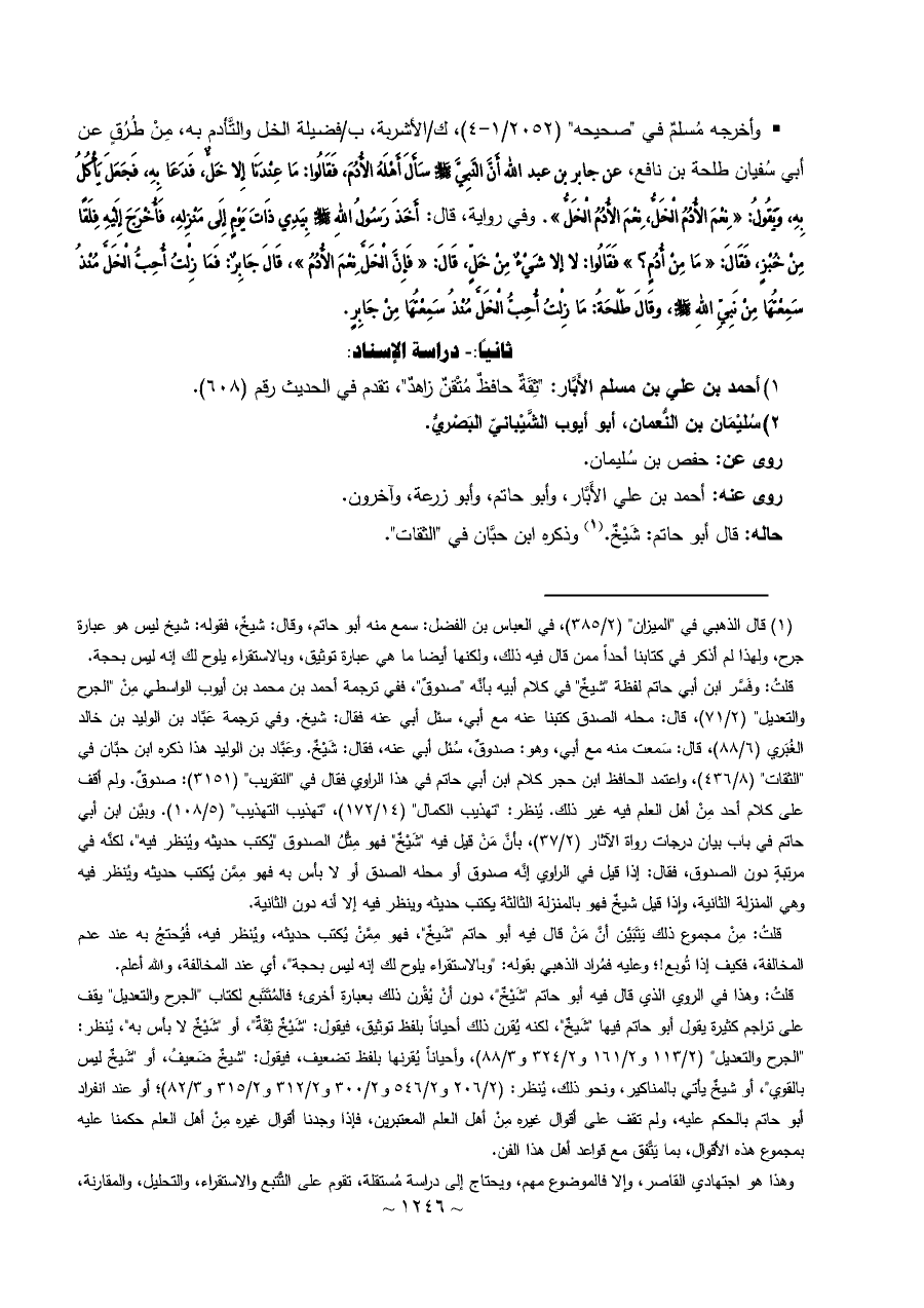(¬١) قال الذهبي في "الميزان" (٢/ ٣٨٥)، في العباس بن الفضل: سمع منه أبو حاتم، وقال: شيخٌ، فقوله: شيخ ليس هو عبارة جرح، ولهذا لم أذكر في كتابنا أحداً ممن قال فيه ذلك، ولكنها أيضا ما هي عبارة توثيق، وبالاستقراء يلوح لك إنه ليس بحجة.