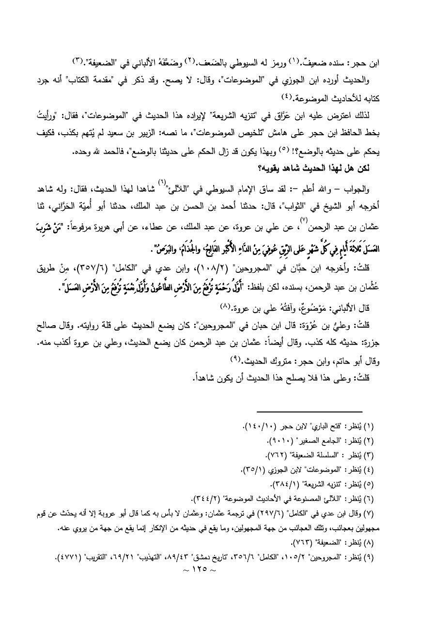 والجواب - والله أعلم -: لقد ساق الإمام السيوطي في "اللآلئ" (¬٦) شاهدا لهذا الحديث، فقال: وله شاهد أخرجه أبو الشيخ في "الثواب"، قال: حدثنا أحمد بن الحسن بن عبد الملك، حدثنا أبو أُميّة الحَرَّاني، ثنا عثمان بن عبد الرحمن (¬٧)، عن علي بن عروة، عن عبد الملك، عن عطاء، عن أبي هريرة مرفوعاً: "مَنْ شَرِبَ العَسَلَ ثَلاثَةَ أَيْامٍ فِي كُلَّ شَهْرٍ عَلى الرِّيْقِ عُوفِيَ مِنْ الدَّاءِ الأَكْبَر الفَالِجُ، والجُذَامُ، والبَرَصُ".