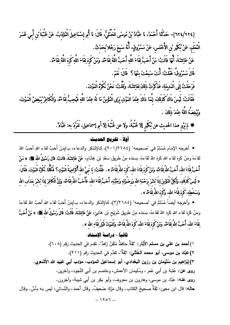 • أخرجه الإمام مُسْلمٌ في "صحيحه" (٢٦٨٤/ ١ - ٢)، ك/الذكر والدعاء، ب/مَنْ أَحَبَّ لقاء اللهِ أحبَّ اللهُ لقاءهُ ومَنْ كَرِهَ لقاء اللهِ كَرِهَ اللهُ لقاءهُ، بسنده مِنْ طريق سَعْدِ بْنِ هِشَامٍ، عَنْ عَائِشَةَ، قالتْ: قال رَسُولُ اللهِ - صلى الله عليه وسلم -: «مَنْ أَحَبَّ لِقَاءَ اللهِ، أَحَبَّ اللهُ لِقَاءَهُ، وَمَنْ كَرِهَ لِقَاءَ اللهِ، كَرِهَ اللهُ لِقَاءَهُ». فَقُلْتُ: يَا نَبِيَّ اللهِ أَكَرَاهِيَةُ الْمَوْتِ؟ فَكُلُّنَا نَكْرَهُ الْمَوْتَ، فَقَالَ: «لَيْسَ كَذَلِكِ، وَلَكِنَّ الْمُؤْمِنَ إِذَا بُشِّرَ بِرَحْمَةِ اللهِ وَرِضْوَانِهِ وَجَنَّتِهِ، أَحَبَّ لِقَاءَ اللهِ، فَأَحَبَّ اللهُ لِقَاءَهُ، وَإِنَّ الْكَافِرَ إِذَا بُشِّرَ بِعَذَابِ اللهِ وَسَخَطِهِ، كَرِهَ لِقَاءَ اللهِ، وَكَرِهَ اللهُ لِقَاءَهُ».