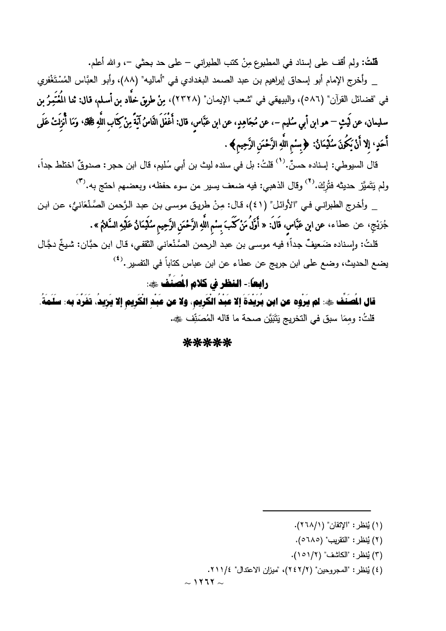 _ وأخرج الإمام أبو إسحاق إبراهيم بن عبد الصمد البغدادي في "أماليه" (٨٨)، وأبو العبَّاس المُسْتَغْفري في "فضائل القرآن" (٥٨٦)، والبيهقي في "شعب الإيمان" (٢٣٢٨)، مِنْ طريق خلَّاد بن أسلم، قال: ثنا المُعْتَمِرُ بن سليمان، عن لَيْثٍ - هو ابن أبي سُليم -، عن مُجَاهِدٍ، عن ابن عَبَّاسٍ، قال: أَغْفَلَ النَّاسُ آيَةً مِنْ كِتَابِ اللَّهِ - عز وجل - , وَمَا أُنْزِلَتْ عَلَى أَحَدٍ, إِلا أَنْ يَكُونَ سُلَيْمَانُ: {بِسْمِ اللَّهِ الرَّحْمَنِ الرَّحِيمِ}.