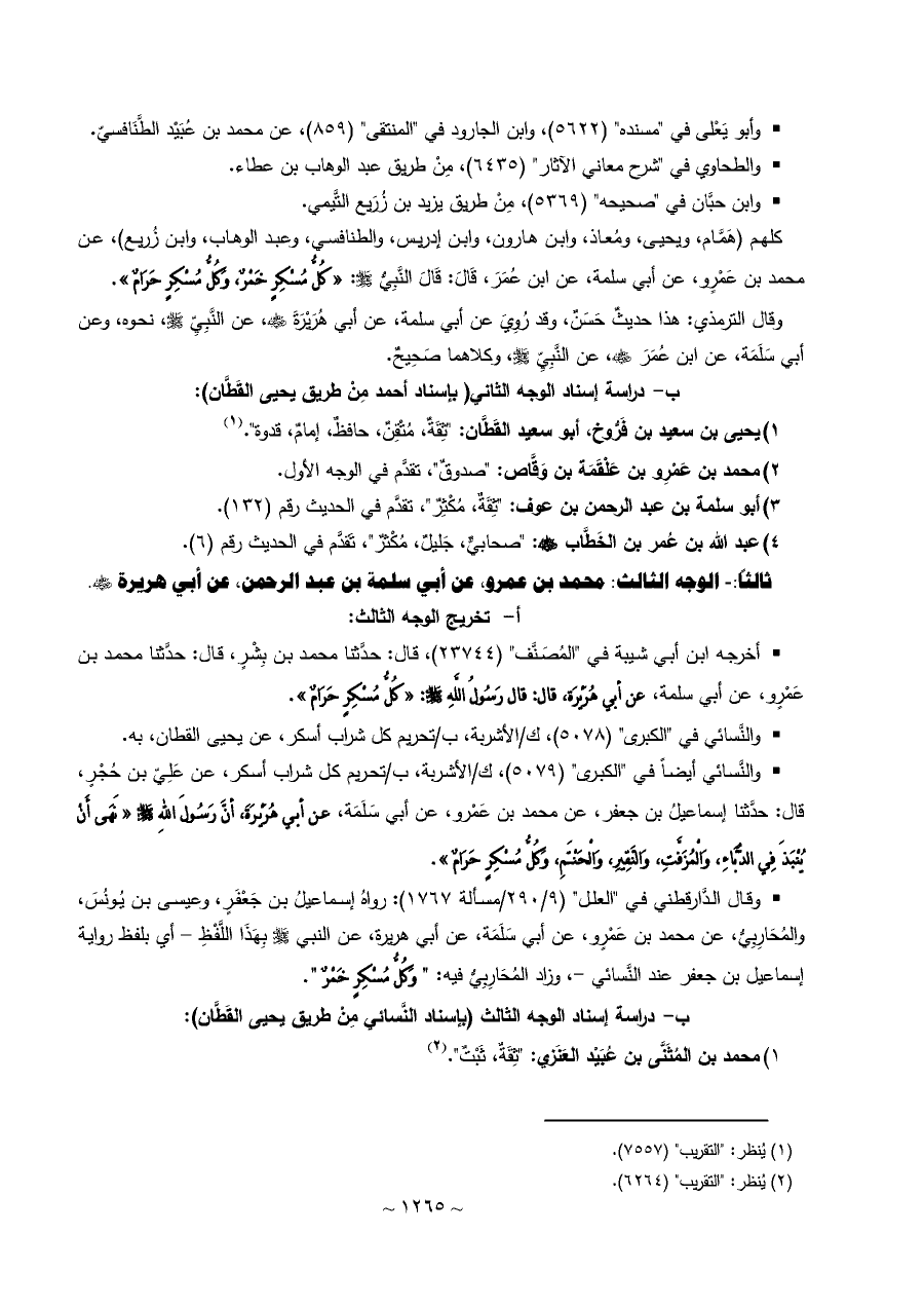كلهم (هَمَّام، ويحيى، ومُعاذ، وابن هارون، وابن إدريس، والطنافسي، وعبد الوهاب، وابن زُريع)، عن محمد بن عَمْرٍو، عن أبي سلمة، عن ابن عُمَرَ، قَالَ: قَالَ النَّبِيُّ - صلى الله عليه وسلم -: «كُلُّ مُسْكِرٍ خَمْرٌ، وَكُلُّ مُسْكِرٍ حَرَامٌ».