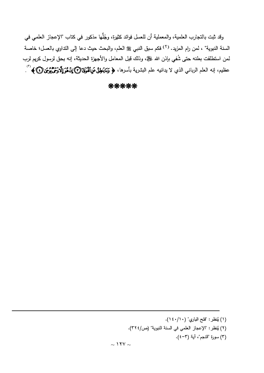 وقد ثبت بالتجارب العلمية، والمعملية أن للعسل فوائد كثيرة، وجُلُّها مذكور في كتاب "الإعجاز العلمي في السنة النبوية"، لمن رام المزيد. (¬١) فكم سبق النبي - صلى الله عليه وسلم - العلم، والبحث حيث دعا إلى التداوي بالعسل؛ خاصة لمن استطلقت بطنه حتى شُفي بإذن الله - جل جلاله -، وذلك قبل المعامل والأجهزة الحديثة، إنه بحق لرسول كريم لرب عظيم، إنه العلم الرباني الذي لا يدانيه علم البشرية بأسرها، {وَمَا يَنْطِقُ عَنِ الْهَوَى (٣) إِنْ هُوَ إِلَّا وَحْيٌ يُوحَى (٤)} (¬٢).