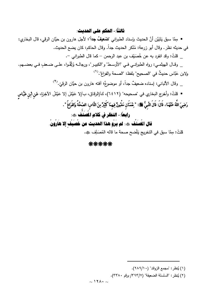 • مِمَّا سبق يَتَبَيَّن أنَّ الحديث بإسناد الطبراني "ضَعيفٌ جداً"؛ لأجل هارون بن حيَّان الرقي، قال البخاري: في حديثه نظر. وقال أبو زرعة: مُنْكر الحديث جداً. وقال الحاكم: كان يضع الحديث.