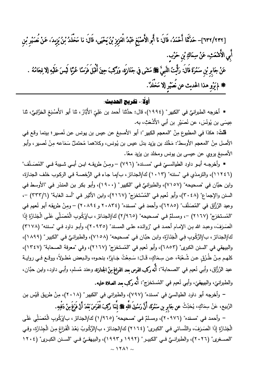 • وأخرجه أبو داود الطيالسيّ في "مسنده" (٧٩٦) - ومِنْ طريقه ابن أبي شيبة في "المُصَنَّف" (١١٢٤٦)، والترمذي في "سننه" (١٠١٣) ك/الجنائز، ب/ما جاء في الرُّخصة في الركوب خلف الجنازة، وابن حبَّان في "صحيحه" (٧١٥٧)، والطبرانيُّ في "الكبير" (١٩٠٠)، وأبو بكر بن المنذر في "الأوسط في السنن والإجماع" (٣٠٤٨)، وأبو نُعيم في "المُسْتخرَج" (٢١٦٧)، وابن الأثير في "أسد الغابة" (٦/ ٣٣٣) -، وعبد الرَّزَّاق في "المُصَنَّف" (٦٢٨٥)، وأحمد في "مسنده" (٢٠٨٣٤ و ٢٠٨٩٤) - ومِنْ طريقه أبو نُعيم في "المُستخرَج" (٢١٦٧) -، ومسلمٌ في "صحيحه" (٩٦٥/ ٢) ك/الجنائز، ب/رُكُوبِ الْمُصَلِّي عَلَى الْجَنَازَةِ إِذَا انْصَرَفَ، وعبد الله بن الإمام أحمد في "زوائده على المسند" (٢٠٩٣٥)، وأبو داود في "سننه" (٣١٧٨) ك/الجنائز، ب/الرُّكُوبِ فِي الْجَنَازَةِ، وابن حبَّان في "صحيحه" (٧١٥٨)، والطبرانيُّ في "الكبير" (١٨٩٩)، والبيهقي في "السنن الكبرى" (٦٨٥٣)، وأبو نُعيم في "المُستخرَج" (٢١٦٧)، وفي "معرفة الصحابة" (١٣٤٧)، كلهم مِنْ طُرُقٍ عن شُعْبَة، عن سِمَاكٍ، قَالَ: سَمِعْتُ جَابِرًا، بنحوه، والبعض مُطولاً، ووقع في رواية ... عبد الرَّزَّاق، وأبي نُعيم في "الصحابة": أنَّه ركب الفرس بعد الفراغ مِنْ الجنازة، وعند مُسلم، وأبي داود، وابن حبَّان، والطبرانيّ، والبيهقيّ، وأبي نُعيم في "المُستخرَج": أنَّه ركب بعد الصلاة عليه.