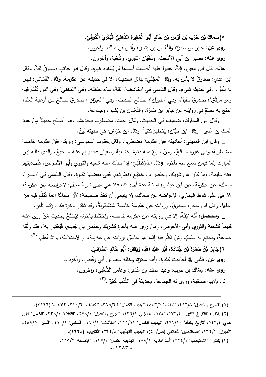 ٥) سِمَاكُ بْنُ حَرْبِ بْنِ أَوْسِ بْنِ خَالِدٍ أَبُو الْمُغِيرَةِ الذُّهَلِيُّ الْبَكْرِيُّ الْكُوفِيُّ.