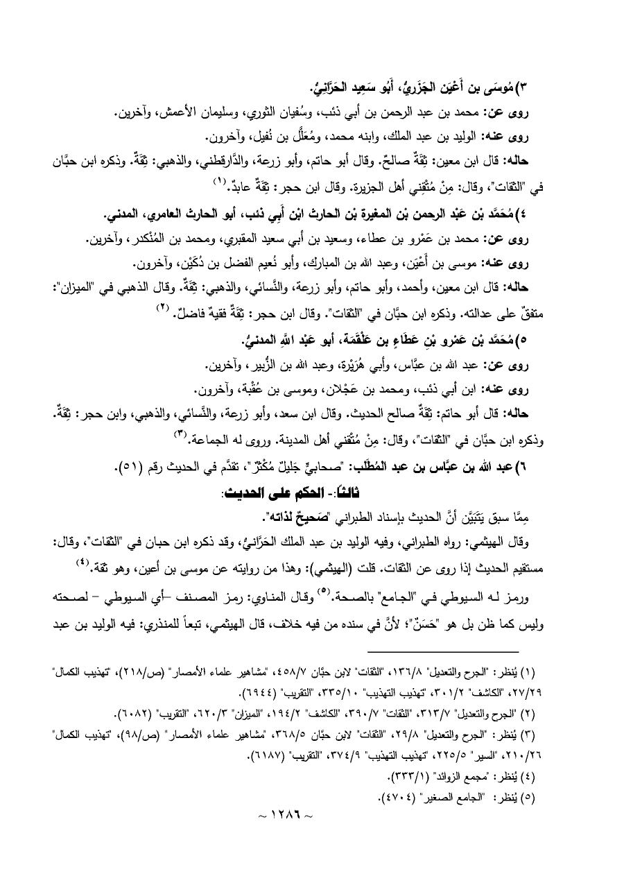 وقال الهيثمي: رواه الطبراني، وفيه الوليد بن عبد الملك الحَرَّانيُّ، وقد ذكره ابن حبان في "الثقات"، وقال: مستقيم الحديث إذا روى عن الثقات. قلت (الهيثمي): وهذا من روايته عن موسى بن أعين، وهو ثقة. (¬٤)