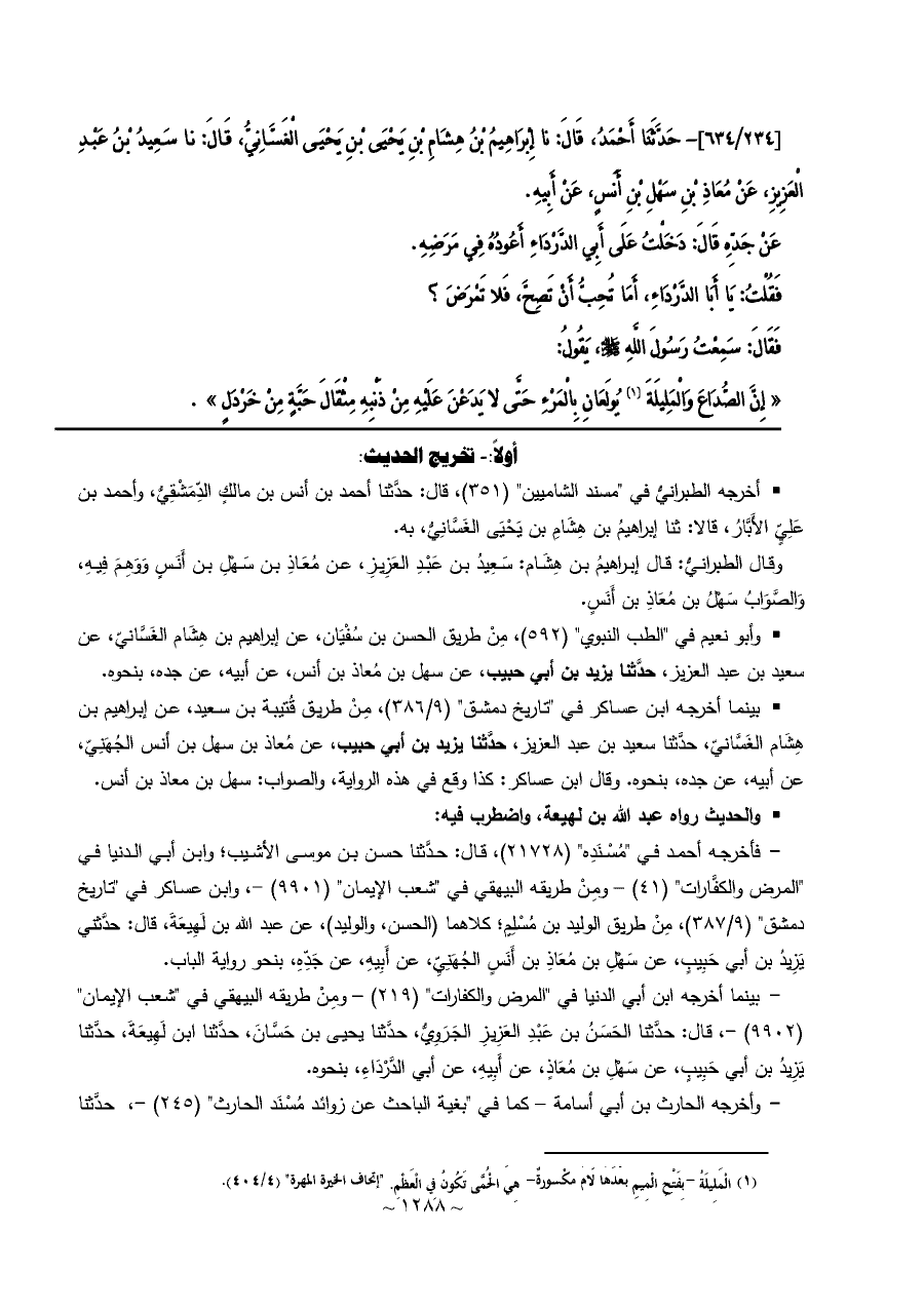 - بينما أخرجه ابن أبي الدنيا في "المرض والكفارات" (٢١٩) - ومِنْ طريقه البيهقي في "شعب الإيمان" (٩٩٠٢) -، قال: حدَّثنا الحَسَنُ بن عَبْدِ العَزِيزِ الجَرَوِيُّ، حدَّثنا يحيى بن حَسَّانَ، حدَّثنا ابن لَهِيعَةَ، حدَّثنا يَزِيدُ بن أبي حَبِيبٍ، عن سَهْلِ بن مُعَاذٍ، عن أَبِيهِ، عن أبي الدَّرْدَاءِ، بنحوه.