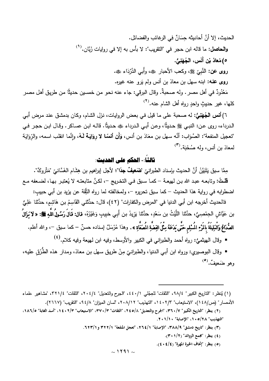 ٦) أنس الجُهَنِيُّ: له صحبة على ما قيل في بعض الروايات، نزل الشام، وكان بدمشق عند مرض أبي الدرداء، روى عن: النبي - صلى الله عليه وسلم - حديثًا، وعن أبي الدرداء - رضي الله عنه - حديثًا. قاله ابن عساكر. وقال ابن حجر في "تعجيل المنفعة": الصَّوَاب: أنَّه سهل بن معَاذ بن أنس، وَأَن أنسًا لا رِوَايَة لَهُ، وإنَّما انقلب اسمه، والرِّوَايَة لمعاذ بن أنس، وله صُحْبَة. (¬٣)