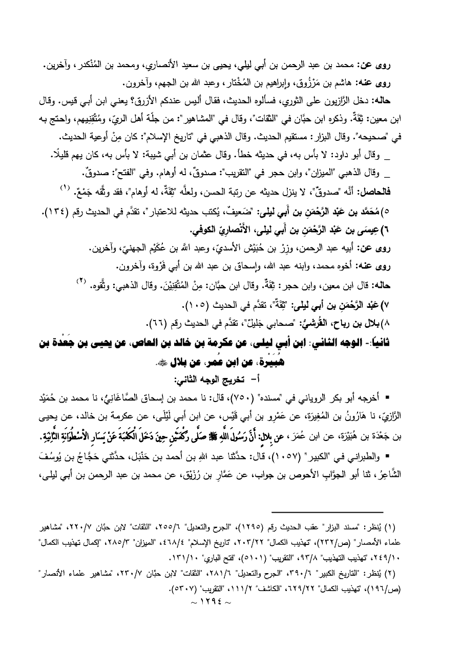 ثانياً: - الوجه الثاني: ابن أبي ليلى، عن عكرمة بن خالد بن العاص، عن يحيى بن جَعْدة بن هُبَيْرة، عن ابن عُمر، عن بلال - رضي الله عنه -.