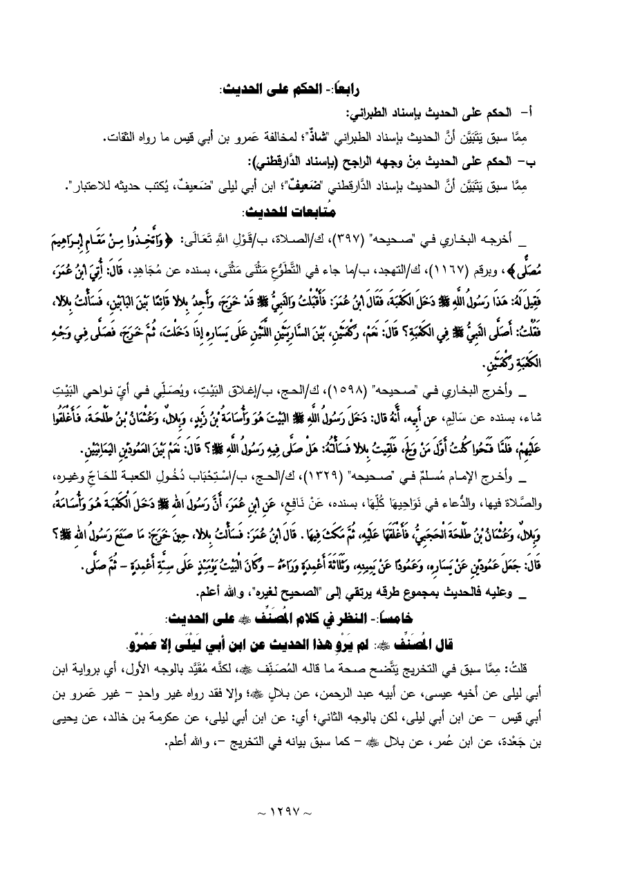 _ وأخرج البخاري في "صحيحه" (١٥٩٨)، ك/الحج، ب/إغلاق البَيْتِ، ويُصَلِّي في أيِّ نواحي البَيْتِ شاء، بسنده عن سَالِمٍ، عن أَبِيه، أَنَّهُ قال: دَخَلَ رَسُولُ اللَّهِ - صلى الله عليه وسلم - البَيْتَ هُوَ وَأُسَامَةُ بْنُ زَيْدٍ، وَبِلالٌ، وَعُثْمَانُ بْنُ طَلْحَةَ، فَأَغْلَقُوا عَلَيْهِمْ، فَلَمَّا فَتَحُوا كُنْتُ أَوَّلَ مَنْ وَلجَ، فَلَقِيتُ بِلالا فَسَأَلْتُهُ: هَلْ صَلَّى فِيهِ رَسُولُ اللَّهِ - صلى الله عليه وسلم -؟ قَالَ: نَعَمْ بَيْنَ العَمُودَيْنِ اليَمَانِيَيْنِ.