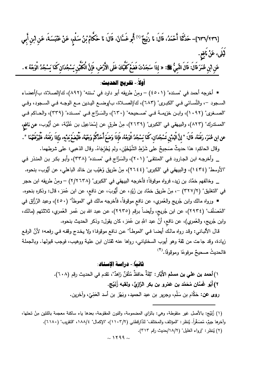 • أخرجه أحمد في "مسنده" (٤٥٠١) - ومِنْ طريقه أبو داود في "سننه" (٨٩٢)، ك/الصلاة، ب/أعضاء السجود -، والنَّسائي في "الكبرى" (٦٨٣)، ك/الصلاة، ب/وضع اليدين مع الوجه في السجود، وفي "الصغرى" (١٠٩٢)، وابن خزيمة في "صحيحه" (٦٣٠)، والسَرَّاج في "مسنده" (٣٣٩)، والحاكم في "المستدرك" (٨٢٣)، والبيهقي في "الكبرى" (٢٦٣٩)، مِنْ طرقٍ عن إِسْمَاعِيل بن عُلَيَّة، عن أَيُّوب، عن نافعٍ، عن ابن عُمَرَ، رَفَعَهُ، قَالَ: " إِنَّ الْيَدَيْنِ تَسْجُدَانِ، كَمَا يَسْجُدُ الْوَجْهُ، فَإِذَا وَضَعَ أَحَدُكُمْ وَجْهَهُ، فَلْيَضَعْ يَدَيْهِ، وَإِذَا رَفَعَهُ، فَلْيَرْفَعْهُمَا ".