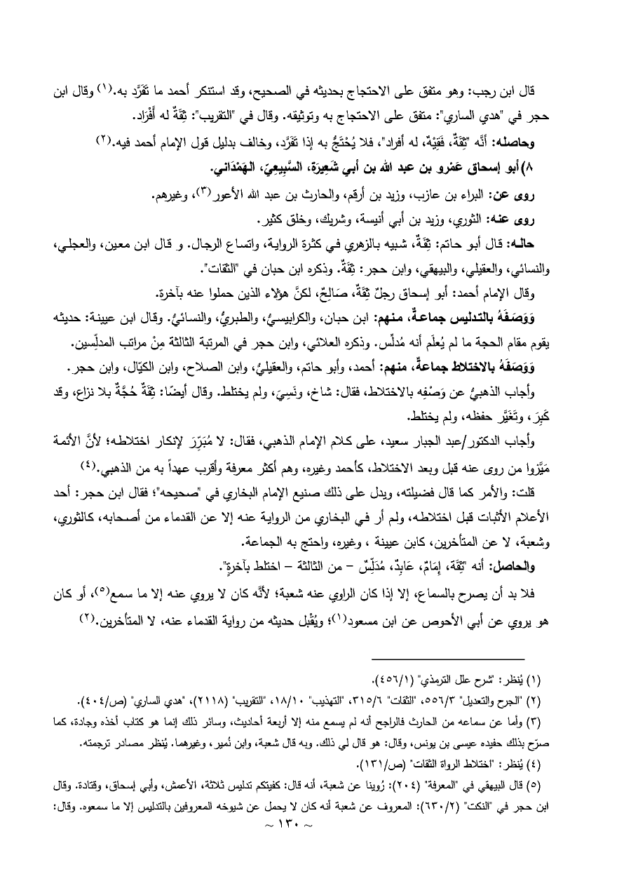(¬٦) قال الشيخ/محمد عمرو عبد اللطيف - رحمه الله -: رواية أبي إسحاق السبيعي، عن أبي الأحوص، عن عبد الله بن مسعود لا تعلّ بعنعنة أبي إسحاق؛ إذ أنَّ أبا إسحاق قد امتلأت ضلوعه من أحاديث أبي الأحوص عوف بن مالك، فقد صَحَّ عن أبي إسحاق، أنه سُئل: كيف كان يحدثكم أبو الأحوص؟ فقال: كان يسكبها علينا في المسجد، حدثنا عبد الله - يعني أن أبا الأحوص أغرقهم من حديث ابن مسعود -، فمثل هذا يبعد في المعتاد أن يحتاج إلى أن يدلس حديثًا عن أبي الأحوص. بتصرف من "معجم المدلسين" لمحمد بن طلعت (ص/٣٥٩).
