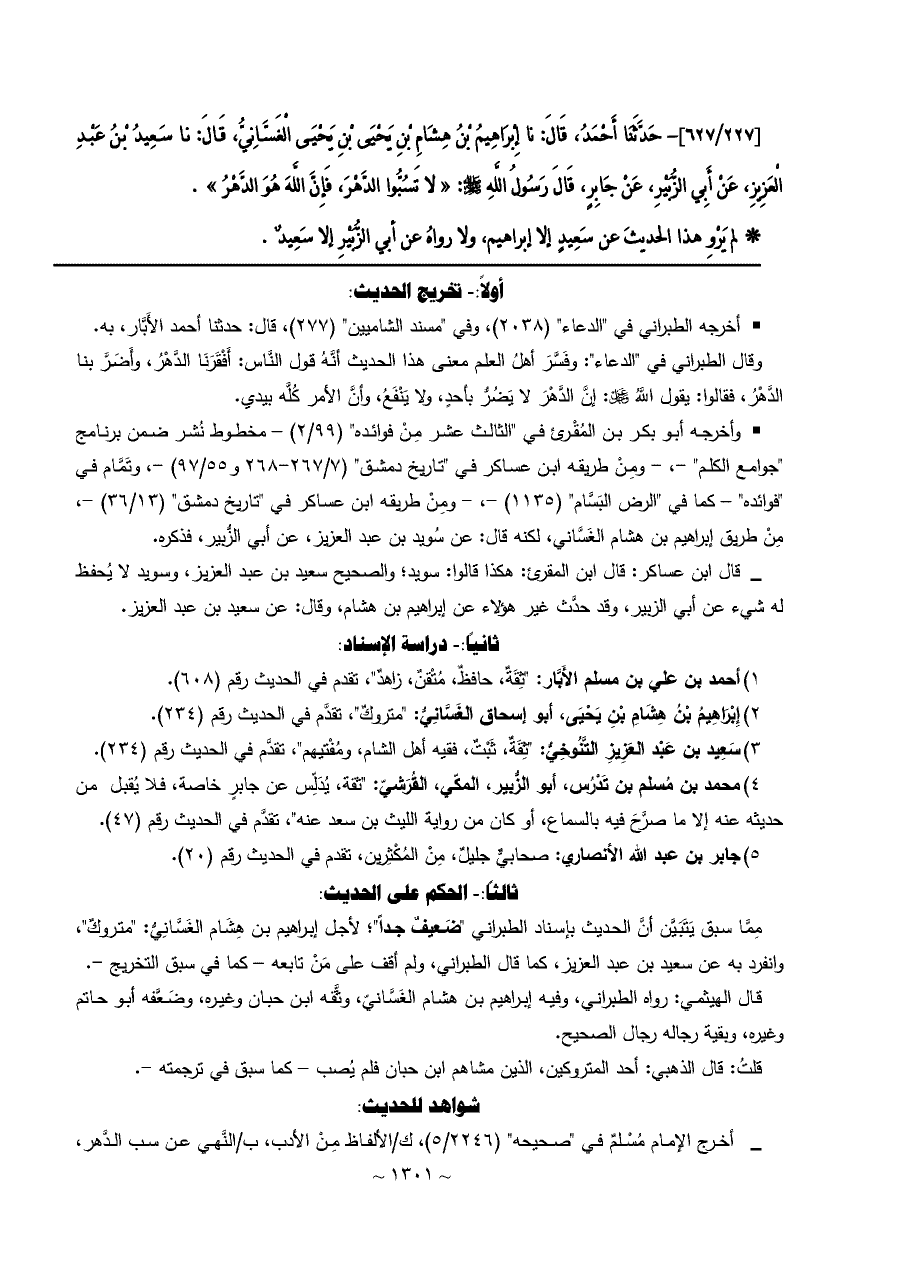 [٢٣٧/ ٦٣٧]- حَدَّثَنَا أَحْمَدُ، قَالَ: نا إِبْرَاهِيمُ بْنُ هِشَامِ بْنِ يَحْيَى بْنِ يَحْيَى الْغَسَّانِيُّ، قَالَ: نا سَعِيدُ بْنُ عَبْدِ الْعَزِيزِ، عَنْ أَبِي الزُّبَيْرِ، عَنْ جَابِرٍ، قَالَ رَسُولُ اللَّهِ - صلى الله عليه وسلم -: «لا تَسُبُّوا الدَّهْرَ، فَإِنَّ اللَّهَ هُوَ الدَّهْرُ».