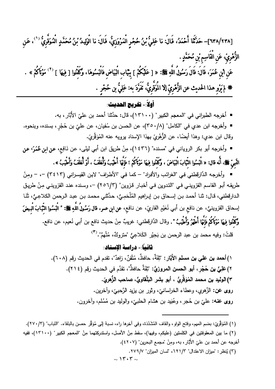 [٢٣٨/ ٦٣٨]- حَدَّثَنَا أَحْمَدُ، قَالَ: نا عَلِيُّ بْنُ حُجْرٍ الْمَرْوَزِيُّ، قَالَ: نا الْوَلِيدُ بْنُ مُحَمَّدٍ الْمُوَقَّرِيُّ (¬١)، عَنِ الزُّهْرِيِّ، عَنِ الْقَاسِمِ بْنِ مُحَمَّدٍ.