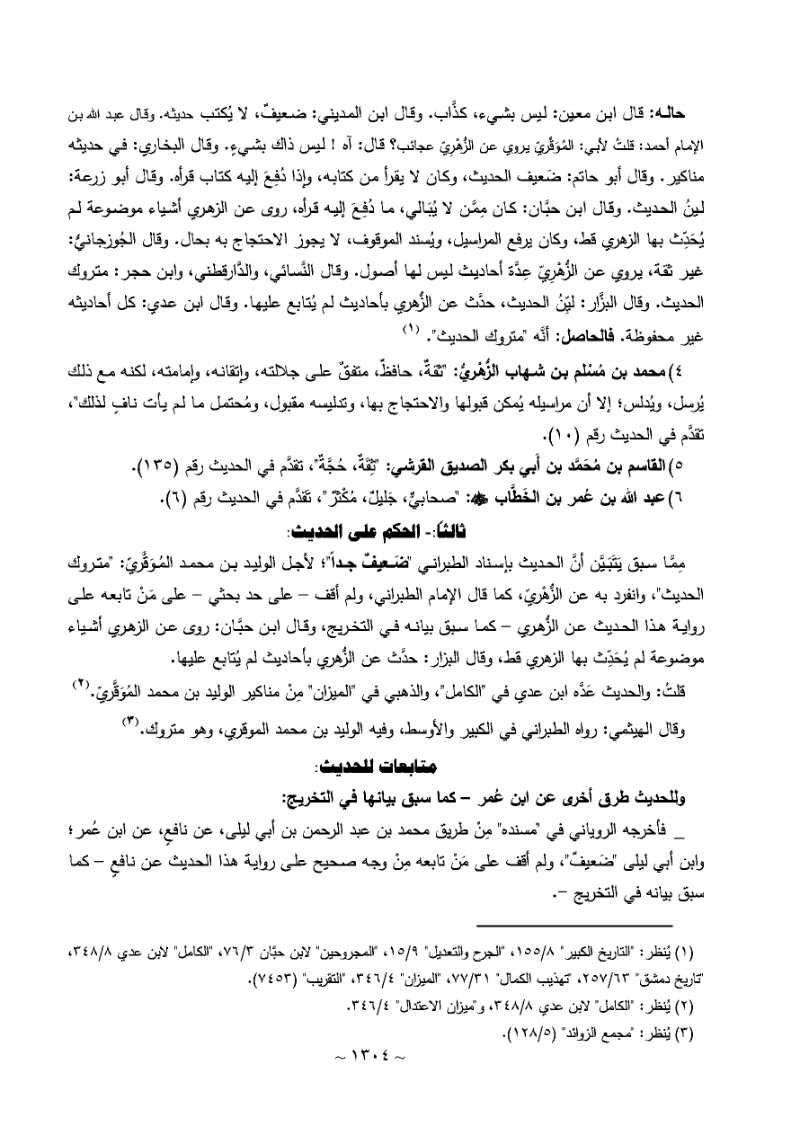 حاله: قال ابن معين: ليس بشيء، كذَّاب. وقال ابن المديني: ضعيفٌ، لا يُكتب حديثه. وقال عبد الله بن الإمام أحمد: قلتُ لأبي: المُوَقَّريّ يروي عن الزُّهْرِيّ عجائب؟ قال: آه! ليس ذاك بشيءٍ. وقال البخاري: في حديثه مناكير. وقال أبو حاتم: ضَعيف الحديث، وكان لا يقرأ من كتابه، وإذا دُفِعَ إليه كتاب قرأه. وقال أبو زرعة: لينُ الحديث. وقال ابن حبَّان: كان مِمَّن لا يُبَالي، ما دُفِعَ إليه قرأه، روى عن الزهري أشياء موضوعة لم يُحَدِّث بها الزهري قط، وكان يرفع المراسيل، ويُسند الموقوف، لا يجوز الاحتجاج به بحال. وقال الجُوزجانيُّ: غير ثقة، يروي عن الزُّهْرِيّ عِدَّة أحاديث ليس لها أصول. وقال النَّسائي، والدَّارقطني، وابن حجر: متروك الحديث. وقال البزَّار: ليِّنُ الحديث، حدَّث عن الزُّهري بأحاديث لم يُتابع عليها. وقال ابن عدي: كل أحاديثه غير محفوظة. فالحاصل: أنَّه "متروك الحديث". (¬١)