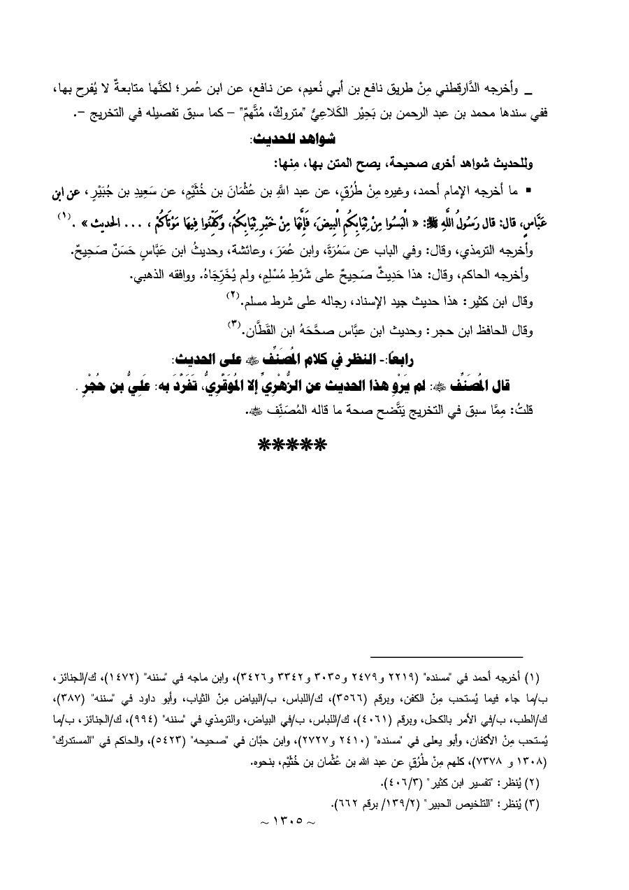 (¬١) أخرجه أحمد في "مسنده" (٢٢١٩ و ٢٤٧٩ و ٣٠٣٥ و ٣٣٤٢ و ٣٤٢٦)، وابن ماجه في "سننه" (١٤٧٢)، ك/الجنائز، ب/ما جاء فيما يُستحب مِنْ الكفن، وبرقم (٣٥٦٦)، ك/اللباس، ب/البياض مِنْ الثياب، وأبو داود في "سننه" (٣٨٧)، ك/الطب، ب/في الأمر بالكحل، وبرقم (٤٠٦١)، ك/اللباس، ب/في البياض، والترمذي في "سننه" (٩٩٤)، ك/الجنائز، ب/ما يُستحب مِنْ الأكفان، وأبو يعلى في "مسنده" (٢٤١٠ و ٢٧٢٧)، وابن حبَّان في "صحيحه" (٥٤٢٣)، والحاكم في "المستدرك" (١٣٠٨ و ٧٣٧٨)، كلهم مِنْ طُرُقٍ عن عبد الله بن عُثْمان بن خُثَيْم، بنحوه.