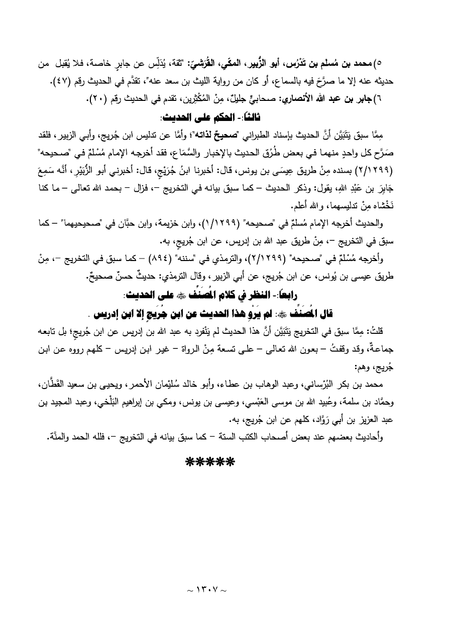 مِمَّا سبق يَتَبَيَّن أنَّ الحديث بإسناد الطبراني "صحيحٌ لذاته"؛ وأمَّا عن تدليس ابن جُريج، وأبي الزبير، فلقد صَرَّح كل واحدٍ منهما في بعض طُرُق الحديث بالإخبار والسَّمَاع، فقد أخرجه الإمام مُسْلمٌ في "صحيحه" (١٢٩٩/ ٢) بسنده مِنْ طريق عِيسَى بن يونس، قال: أخبرنا ابنُ جُرَيْجٍ، قال: أخبرني أبو الزُّبَيْرِ، أنَّه سَمِعَ جَابِرَ بن عَبْدِ اللهِ، يقول: وذكر الحديث - كما سبق بيانه في التخريج -، فزال - بحمد الله تعالى - ما كنا نَخْشاه مِنْ تدليسهما، والله أعلم.