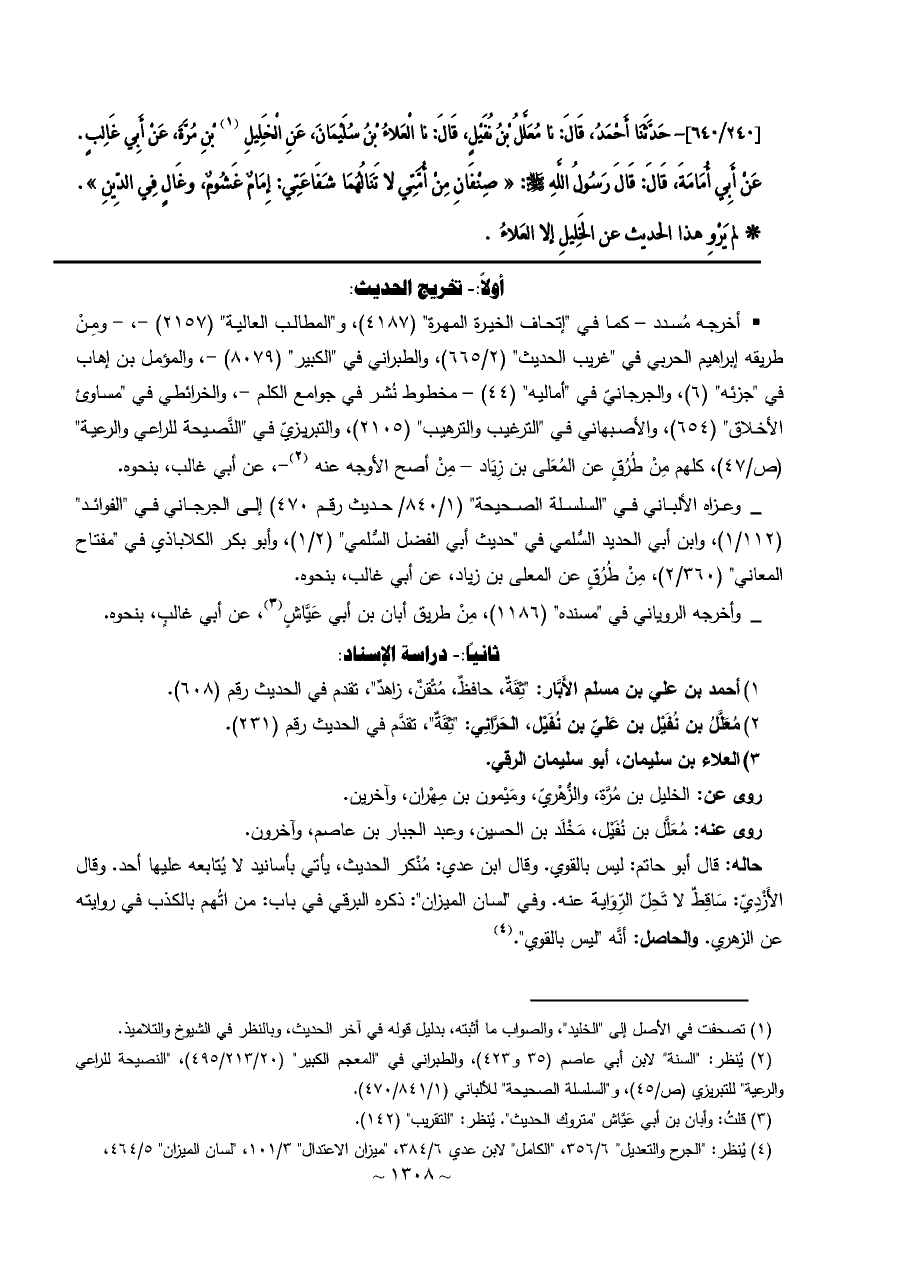 [٢٤٠/ ٦٤٠]- حَدَّثَنَا أَحْمَدُ، قَالَ: نا مُعَلَّلُ بْنُ نُفَيْلٍ، قَالَ: نا الْعَلاءُ بْنُ سُلَيْمَانَ، عَنِ الْخَلِيلِ (¬١) بْنِ مُرَّةَ، عَنْ أَبِي غَالِبٍ.