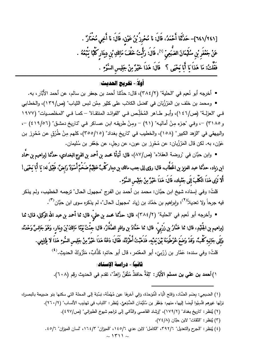 • وأخرجه أبو نُعيم في "الحلية" (٢/ ٣٨٤)، قال: حدَّثنا محمد بن عليٍّ، قال: ثنا أحمد بن عبد اللهِ الوكيل، قال: ثنا إبراهيم بن الجُنَيْدِ، قال: ثنا عَمَّارُ بن زَرْبِيٍّ، قال: ثنا حَمَّادُ بن واقدٍ الصَّفَّارُ، قال: جِئْتُ يَوْمًا مَالِكَ بْنَ دِينَارٍ، وَهُوَ جَالِسٌ وَحْدَهُ، وَإِلَى جَانِبِهِ كَلْبٌ، وَقَدْ وَضَعَ خُرْطُومَهُ بَيْنَ يَدَيْهِ، فَذَهَبْتُ أَطْرُدُهُ، فَقَالَ: دَعْهُ هَذَا خَيْرٌ مِنْ جَلِيسِ السُّوءِ هَذَا لا يؤْذِينِي.