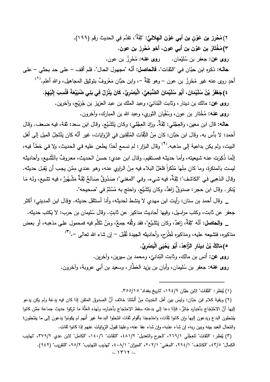 (¬٢) وبقية كلام ابن حبَّان: وليس بين أهل الحَدِيث مِنْ أَئِمَّتنَا خلاف أنَّ الصدوق المتقن إذا كان فيه بِدعَة ولم يكن يدعو إليها أنَّ الاحْتِجَاج بأخباره جَائِزٌ، فإذا دعا إلى بدعته سقط الاحتجاج بأخباره، ولهذه العلَّة ما تركوا حديث جماعة مِمَّن كانوا ينتحلون البدع ويدعون إليها وإن كانوا ثِقَات، واحتججنا بأقوام ثقات انتحلوا البدعة غير أَنهم لم يكونوا يدعون إلى ما ينتحلون؛ وانتحال العبد بينه وبين ربه، إن شاء عذبه، وإن شاء عفا عنه، وعلينا قبول الرِّوَايَات عنهم إذا كانوا ثقات.