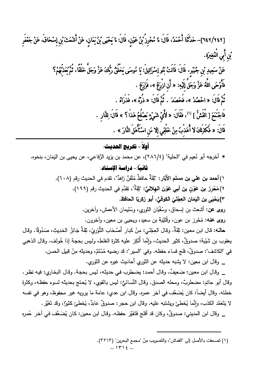 • أخرجه أبو نُعيم في "الحلية" (٤/ ٢٨٦)، عن محمد بن يزيد الرَّفاعي، عن يحيى بن اليَمَان، بنحوه.