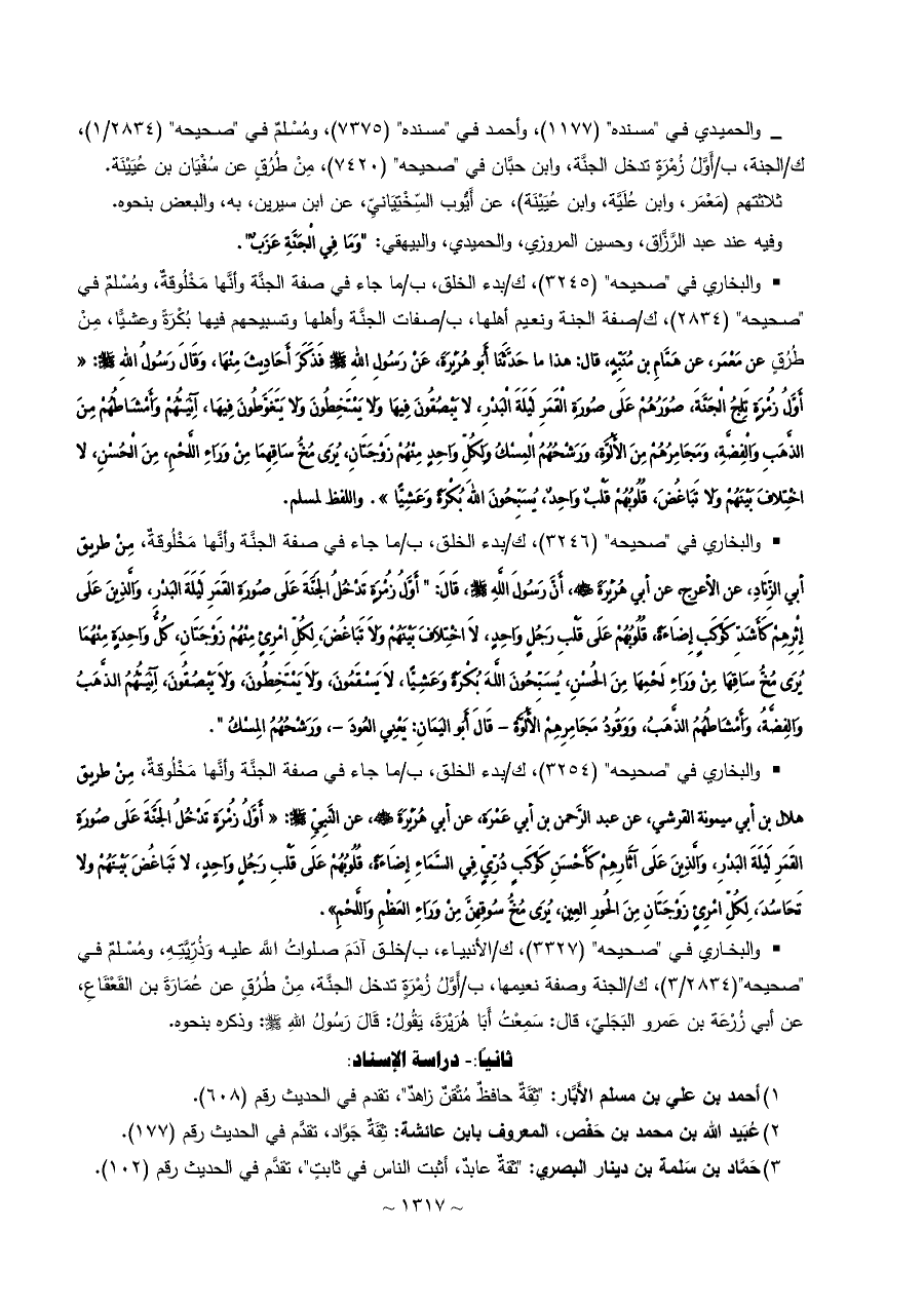 - والحميدي في "مسنده" (١١٧٧)، وأحمد في "مسنده" (٧٣٧٥)، ومُسْلمٌ في "صحيحه" (٢٨٣٤/ ١)، ك/الجنة، ب/أَوَّلُ زُمْرَةٍ تدخل الجنَّة، وابن حبَّان في "صحيحه" (٧٤٢٠)، مِنْ طُرُقٍ عن سُفْيَان بن عُيَيْنَة.