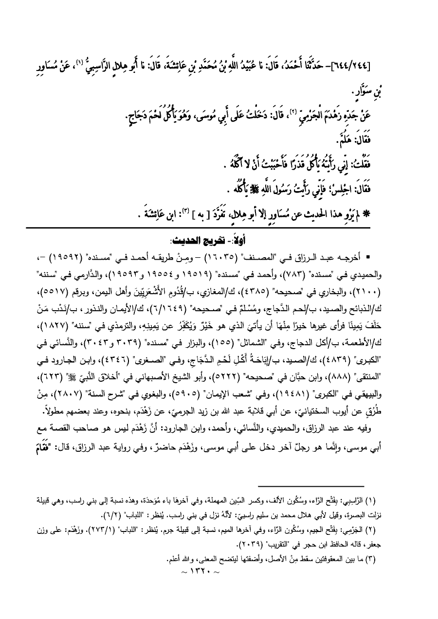 • أخرجه عبد الرزاق في "المصنف" (١٦٠٣٥) - ومِنْ طريقه أحمد في "مسنده" (١٩٥٩٢) -، والحميدي في "مسنده" (٧٨٣)، وأحمد في "مسنده" (١٩٥١٩ و ١٩٥٥٤ و ١٩٥٩٣)، والدَّارمي في "سننه" (٢١٠٠)، والبخاري في "صحيحه" (٤٣٨٥)، ك/المغازي، ب/قُدُومِ الأَشْعَرِيِّينَ وأهل اليمن، وبرقم (٥٥١٧)، ك/الذبائح والصيد، ب/لحم الدَّجاج، ومُسْلمٌ في "صحيحه" (١٦٤٩/ ٦)، ك/الأيمان والنذور، ب/نَدْب مَنْ حَلَفَ يَمِينًا فرأى غيرها خيرًا مِنْهَا أن يأتيَ الذي هو خَيْرٌ وَيُكَفِّرُ عن يَمِينِهِ، والترمذي في "سننه" (١٨٢٧)، ك/الأطعمة، ب/أكل الدجاج، وفي "الشمائل" (١٥٥)، والبزار في "مسنده" (٣٠٣٩ و ٣٠٤٣)، والنَّسائي في "الكبرى" (٤٨٣٩)، ك/الصيد، ب/إِبَاحَةُ أَكْلِ لَحْمِ الدَّجَاجِ، وفي "الصغرى" (٤٣٤٦)، وابن الجارود في "المنتقى" (٨٨٨)، وابن حبَّان في "صحيحه" (٥٢٢٢)، وأبو الشيخ الأصبهاني في "أخلاق النَّبيّ - صلى الله عليه وسلم - " (٦٢٣)، والبيهقي في "الكبرى" (١٩٤٨١)، وفي "شعب الإيمان" (٥٩٠٥)، والبغوي في "شرح السنة" (٢٨٠٧)، مِنْ طُرُقٍ عن أيوب السختيانيّ، عن أبي قلابة عبد الله بن زيد الجرميّ، عن زَهْدَم، بنحوه، وعند بعضهم مطولاً.