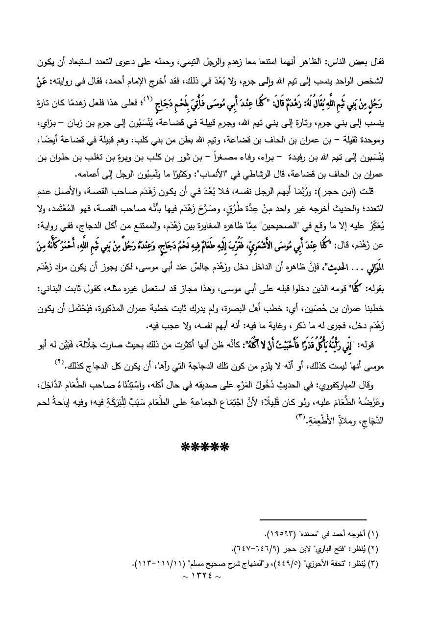 فقال بعض الناس: الظاهر أنهما امتنعا معا زهدم والرجل التيمي، وحمله على دعوى التعدد استبعاد أن يكون الشخص الواحد ينسب إلى تيم الله وإلى جرم، ولا بُعْدَ في ذلك، فقد أخرج الإمام أحمد، فقال في روايته: عَنْ رَجُلٍ مِنْ بَنِي تَيْمِ اللَّهِ يُقَالُ لَهُ: زَهْدَمٌ قَالَ: " كُنَّا عِنْدَ أَبِي مُوسَى فَأُتِيَ بِلَحْمِ دَجَاجٍ (¬١)؛ فعلى هذا فلعل زهدمًا كان تارة ينسب إلى بني جرم، وتارة إلى بني تيم الله، وجرم قبيلة في قضاعة، يُنْسَبُون إلى جرم بن زبان - بزاي، وموحدة ثقيلة - بن عمران بن الحاف بن قضاعة، وتيم الله بطن من بني كلب، وهم قبيلة في قضاعة أيضًا، يُنْسَبون إلى تيم الله بن رفيدة - براء، وفاء مصغراً - بن ثور بن كلب بن وبرة بن تغلب بن حلوان بن عمران بن الحاف بن قضاعة، قال الرشاطي في "الأنساب": وكثيرًا ما يَنْسِبُون الرجل إلى أعمامه.
