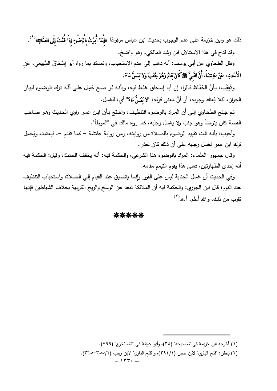 ذلك هو وابن خزيمة على عدم الوجوب بحديث ابن عباس مرفوعًا «إِنَّمَا أُمِرْتُ بِالْوَضُوءِ إِذَا قُمْتُ إِلَى الصَّلاةِ» (¬١).