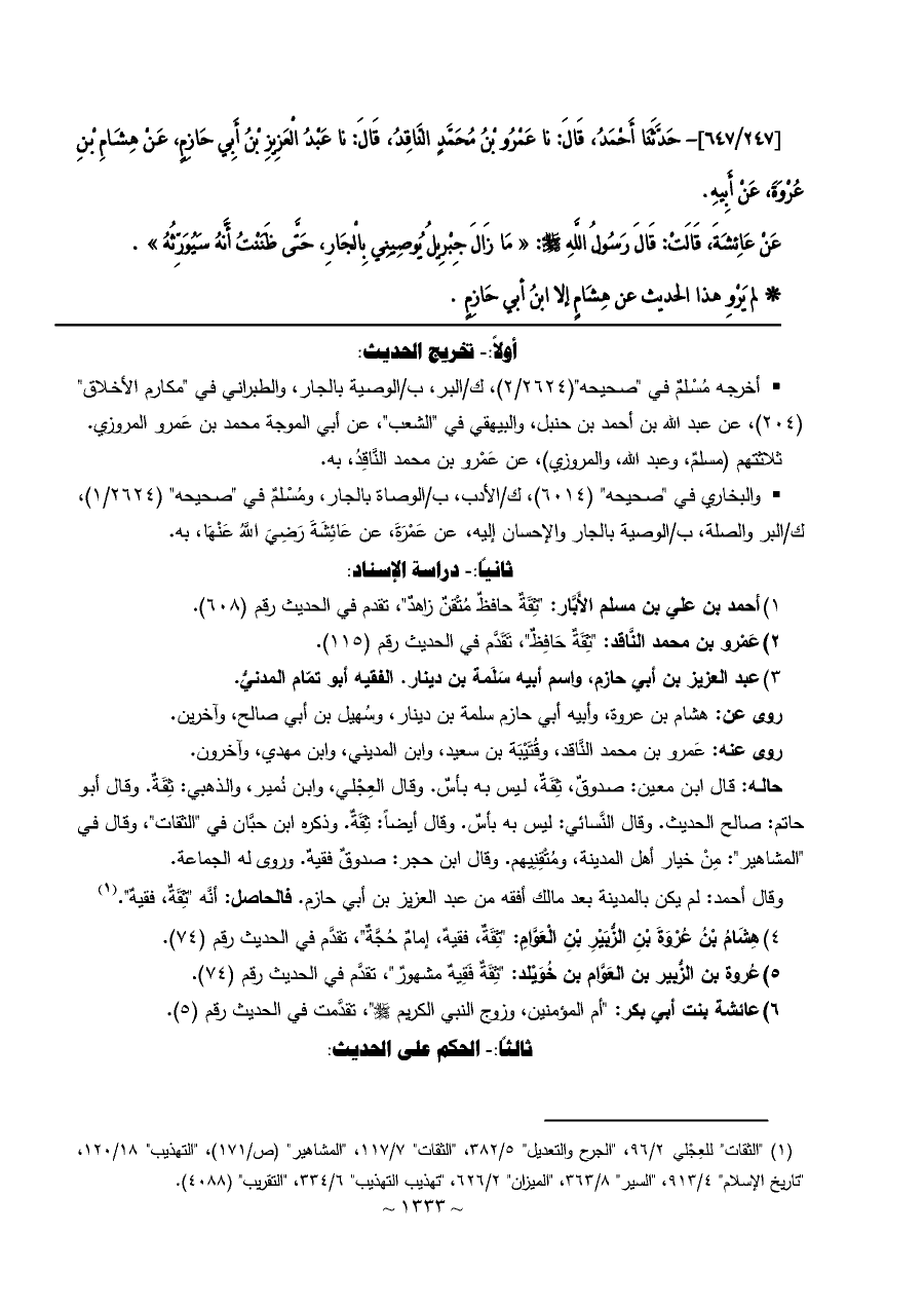 [٢٤٧/ ٦٤٧]- حَدَّثَنَا أَحْمَدُ، قَالَ: نا عَمْرُو بْنُ مُحَمَّدٍ النَّاقِدُ، قَالَ: نا عَبْدُ الْعَزِيزِ بْنُ أَبِي حَازِمٍ، عَنْ هِشَامِ بْنِ عُرْوَةَ، عَنْ أَبِيهِ.