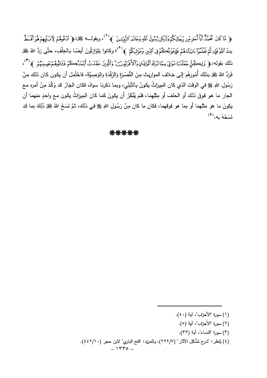 {مَا كَانَ مُحَمَّدٌ أَبَا أَحَدٍ مِنْ رِجَالِكُمْ وَلَكِنْ رَسُولَ اللَّهِ وَخَاتَمَ النَّبِيِّينَ} (¬١)، وبقوله - عز وجل -: {ادْعُوهُمْ لِآبَائِهِمْ هُوَ أَقْسَطُ عِنْدَ اللَّهِ فَإِنْ لَمْ تَعْلَمُوا آبَاءَهُمْ فَإِخْوَانُكُمْ فِي الدِّينِ وَمَوَالِيكُمْ} (¬٢)؛ وكانوا يَتَوَارَثُونَ أيضًا بالحِلْفِ، حتَّى رَدَّ اللهُ - عز وجل - ذلك بقوله: {وَلِكُلٍّ جَعَلْنَا مَوَالِيَ مِمَّا تَرَكَ الْوَالِدَانِ وَالْأَقْرَبُونَ وَالَّذِينَ عَقَدَتْ أَيْمَانُكُمْ فَآتُوهُمْ نَصِيبَهُمْ} (¬٣)، فَرَدَّ اللهُ - عز وجل - بذلك أُمُورَهُم إلى خلاف المواريث مِنَ النُّصْرَةِ وَالرِّفْدَةِ والوَصِيَّةِ, فاحْتُمِلَ أن يكون كان ذلك مِنْ رَسُولِ اللهِ - صلى الله عليه وسلم - في الوقت الذي كان المِيرَاثُ يكونُ بالتَّبَنِّي, وبما ذكرنا سواهُ، فكان الجَارُ قد وُكَّدَ مِنْ أمره مع الجار ما هو فوق ذلك أو الحلف أو مِثلِهِمَا, فلم يُنْكَرْ أن يكونَ كما كان المِيرَاثُ يكون مع واحدٍ منهما أن يكونَ ما هو مثلهما أو بما هو فوقهما, فكان ما كان مِنْ رَسُولِ اللهِ - صلى الله عليه وسلم - في ذلك, ثمَّ نَسَخَ اللهُ - عز وجل - ذَلِكَ بما قد نَسَخَهُ به. (¬٤)