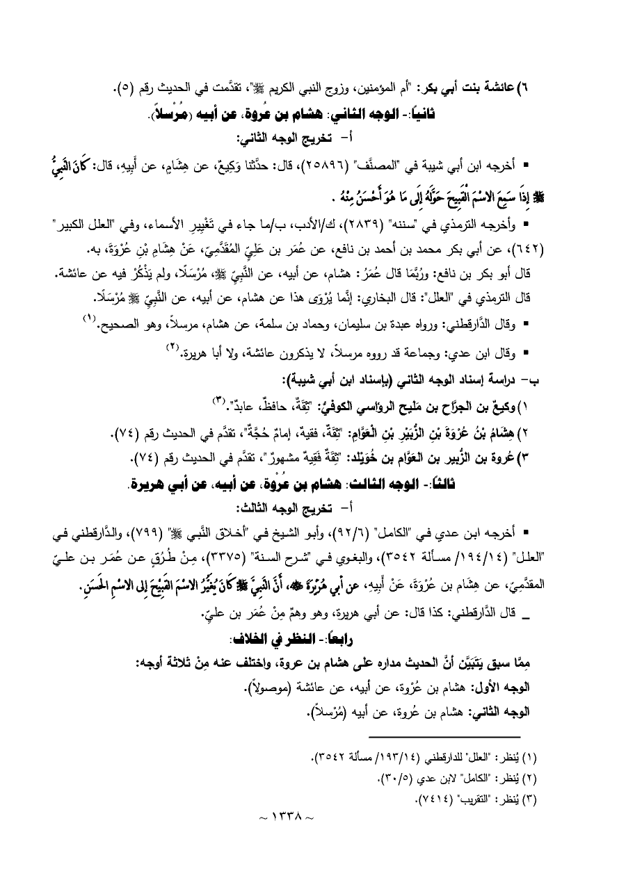 قال أبو بكر بن نافع: ورُبَّمَا قال عُمَرُ: هشام، عن أبيه، عن النَّبِيِّ - صلى الله عليه وسلم -، مُرْسَلًا، ولم يَذْكُرْ فيه عن عائشة.