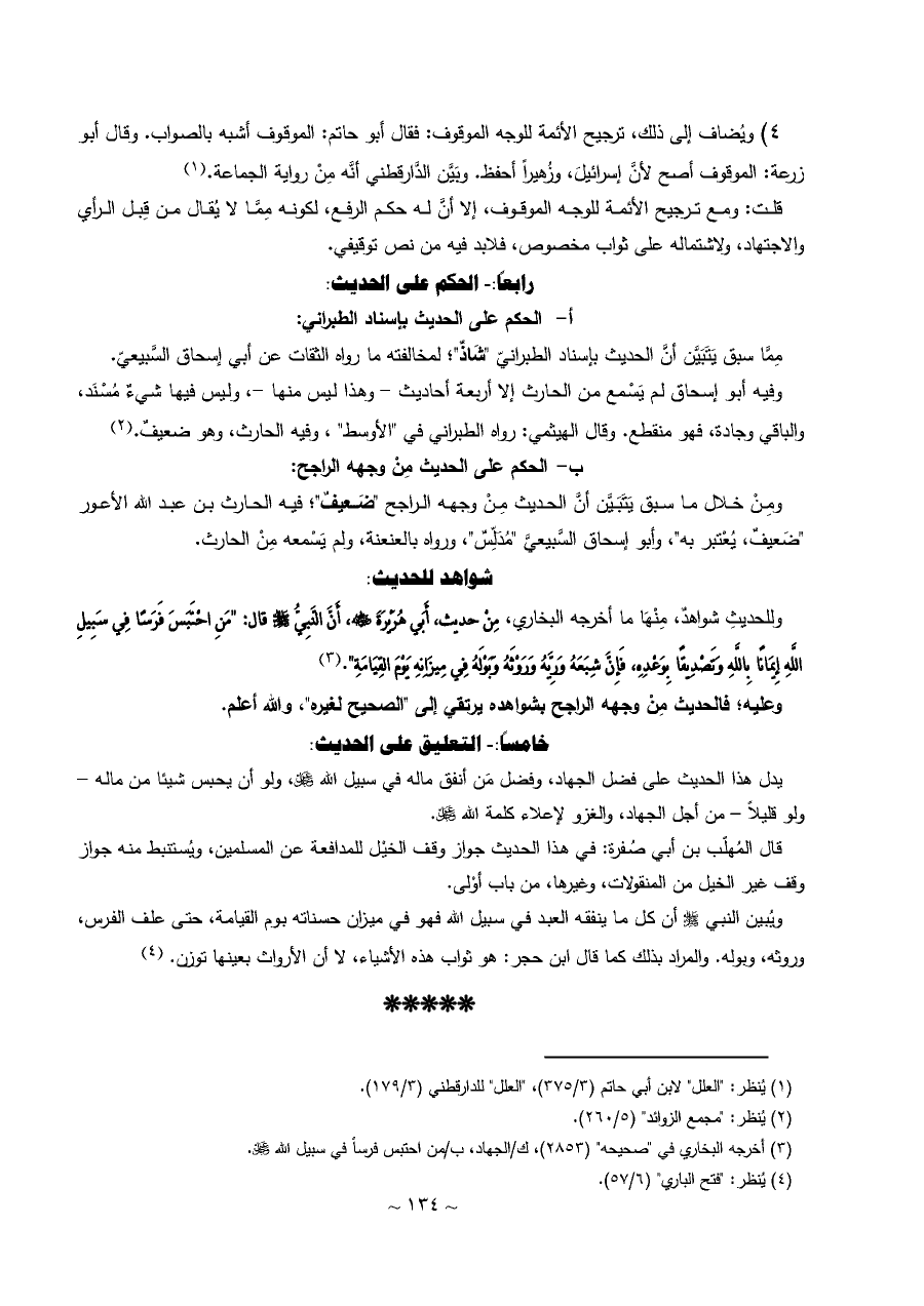 ٤) ويُضاف إلى ذلك، ترجيح الأئمة للوجه الموقوف: فقال أبو حاتم: الموقوف أشبه بالصواب. وقال أبو زرعة: الموقوف أصح لأنَّ إسرائيلَ، وزُهيراً أحفظ. وبَيَّن الدَّارقطني أنَّه مِنْ رواية الجماعة. (¬١)