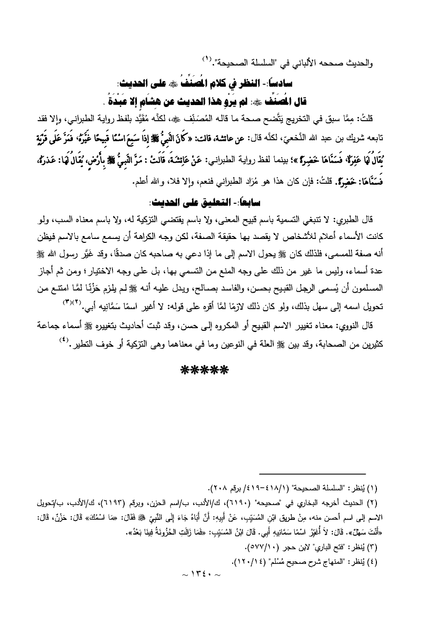(¬٢) الحديث أخرجه البخاري في "صحيحه" (٦١٩٠)، ك/الأدب، ب/اسم الحزن، وبرقم (٦١٩٣)، ك/الأدب، ب/تحويل الاسم إلى اسم أحسن منه، مِنْ طريق ابْنِ المُسَيِّبِ، عَنْ أَبِيهِ: أَنَّ أَبَاهُ جَاءَ إِلَى النَّبِيِّ - صلى الله عليه وسلم - فَقَالَ: «مَا اسْمُكَ» قَالَ: حَزْنٌ، قَالَ: «أَنْتَ سَهْلٌ». قَالَ: لَا أُغَيِّرُ اسْمًا سَمَّانِيهِ أَبِي. قَالَ ابْنُ المُسَيِّبِ: «فَمَا زَالَتِ الحُزُونَةُ فِينَا بَعْدُ».