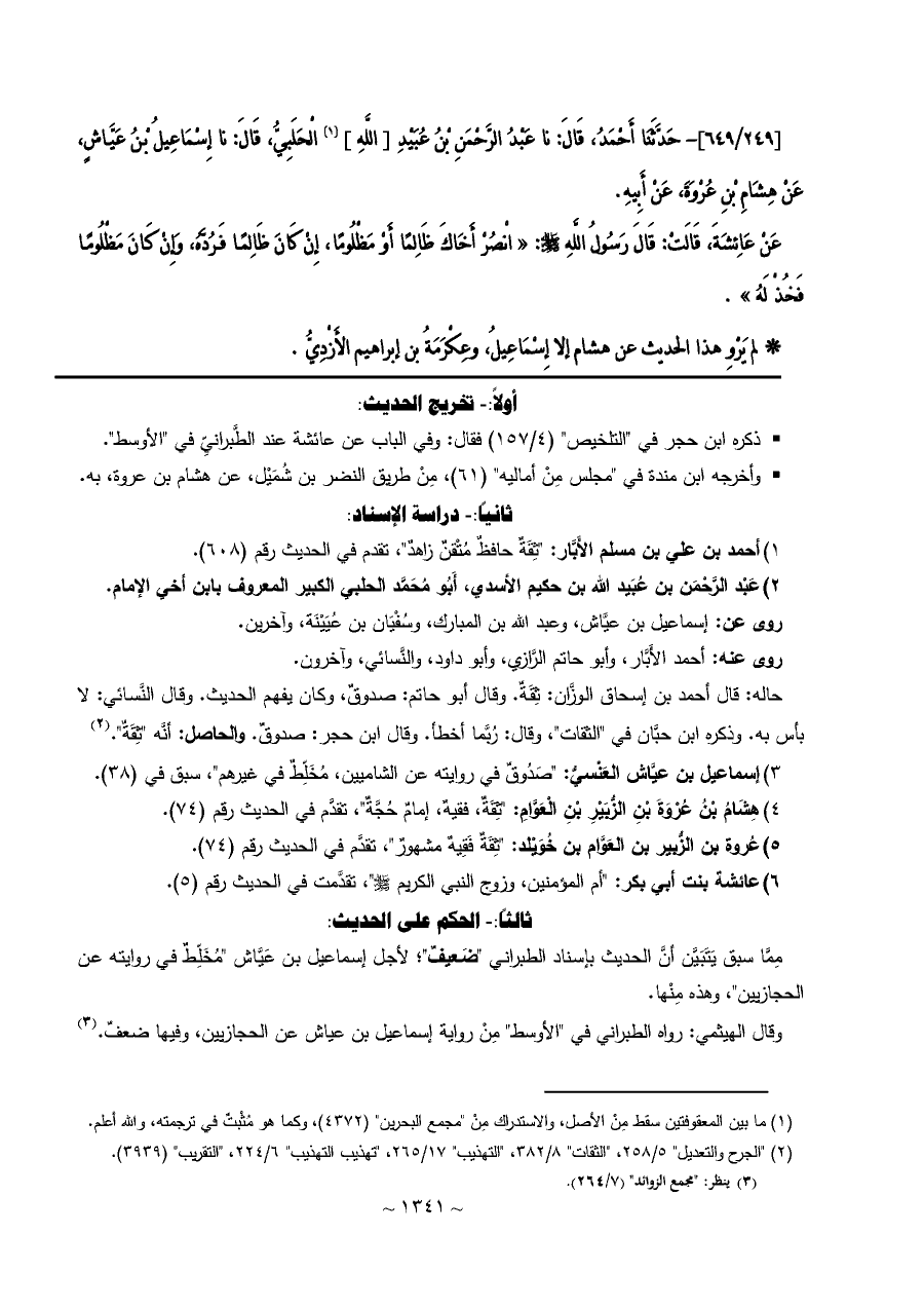 [٢٤٩/ ٦٤٩]- حَدَّثَنَا أَحْمَدُ، قَالَ: نا عَبْدُ الرَّحْمَنِ بْنُ عُبَيْدِ [اللَّهِ] (¬١) الْحَلَبِيُّ، قَالَ: نا إِسْمَاعِيلُ بْنُ عَيَّاشٍ، عَنْ هِشَامِ بْنِ عُرْوَةَ، عَنْ أَبِيهِ.