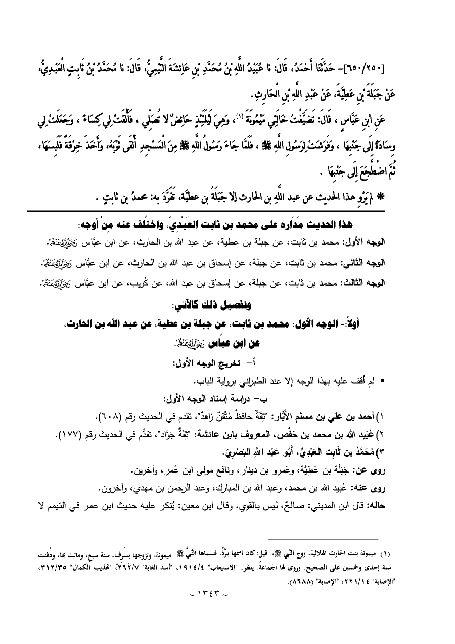 أولاً: - الوجه الأول: محمد بن ثابت، عن جبلة بن عطية، عن عبد الله بن الحارث، ... عن ابن عبَّاس - رضي الله عنهما -.