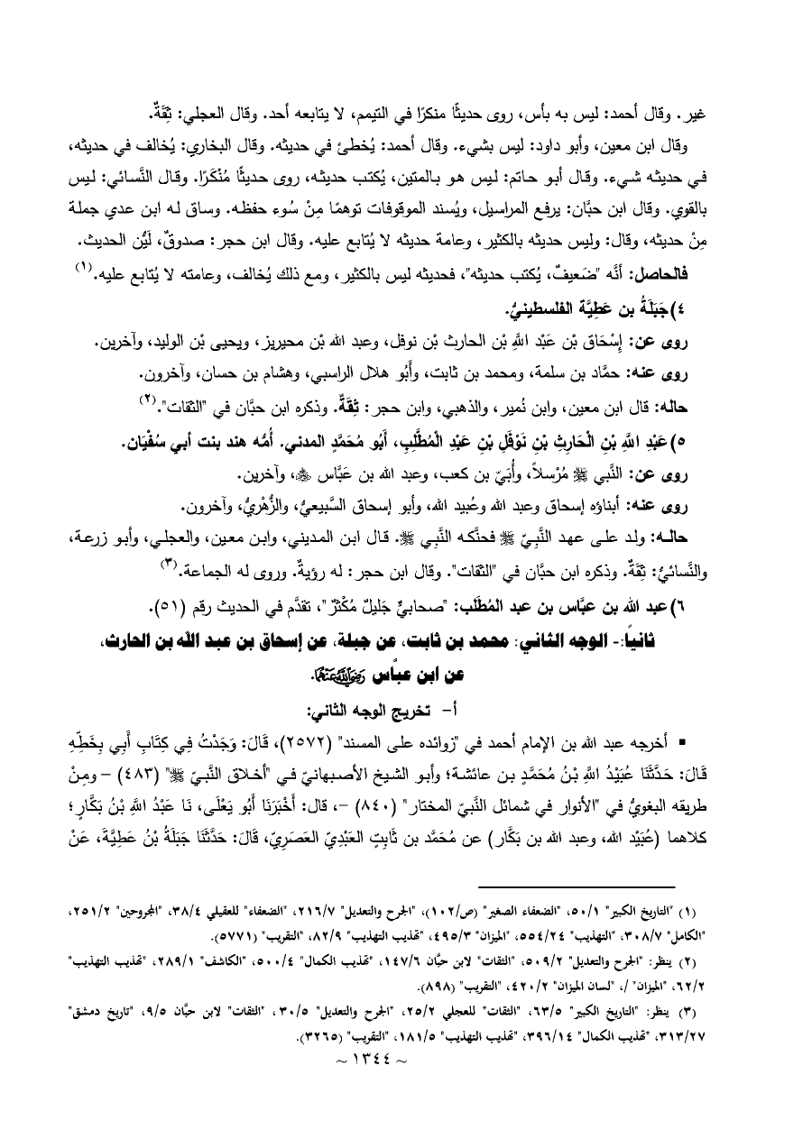 • أخرجه عبد الله بن الإمام أحمد في "زوائده على المسند" (٢٥٧٢)، قَالَ: وَجَدْتُ فِي كِتَابِ أَبِي بِخَطِّهِ قَالَ: حَدَّثَنَا عُبَيْدُ اللَّهِ بْنُ مُحَمَّدٍ بن عائشة؛ وأبو الشيخ الأصبهانيّ في "أخلاق النَّبيّ - صلى الله عليه وسلم - " (٤٨٣) - ومِنْ طريقه البغويُّ في "الأنوار في شمائل النَّبيّ المختار" (٨٤٠) -، قال: أَخْبَرَنَا أَبُو يَعْلَى، نَا عَبْدُ اللَّهِ بْنُ بَكَّارٍ؛ كلاهما (عُبَيْد الله، وعبد الله بن بَكَّار) عن مُحَمَّد بن ثَابِتٍ العَبْدِيّ العَصَرِيّ، قَالَ: حَدَّثَنَا جَبَلَةُ بْنُ عَطِيَّةَ، عَنْ