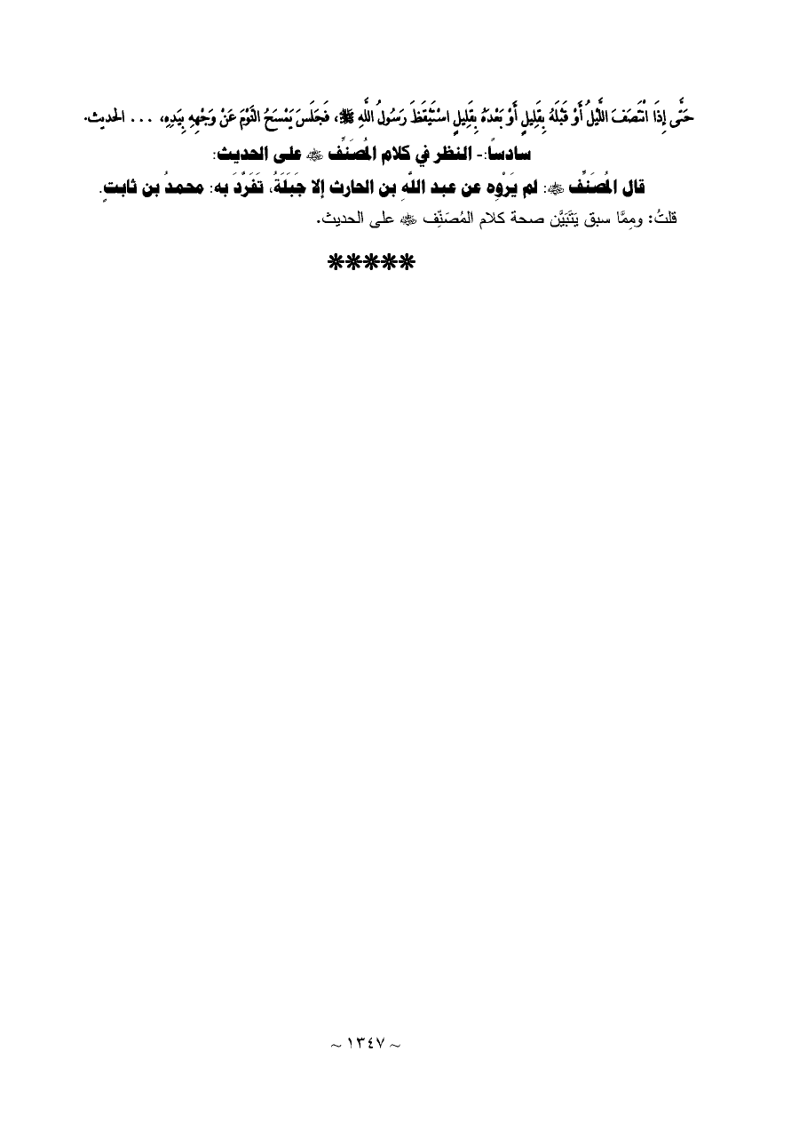 حَتَّى إِذَا انْتَصَفَ اللَّيْلُ أَوْ قَبْلَهُ بِقَلِيلٍ أَوْ بَعْدَهُ بِقَلِيلٍ اسْتَيْقَظَ رَسُولُ اللَّهِ - صلى الله عليه وسلم -، فَجَلَسَ يَمْسَحُ النَّوْمَ عَنْ وَجْهِهِ بِيَدِهِ، ... الحديث.