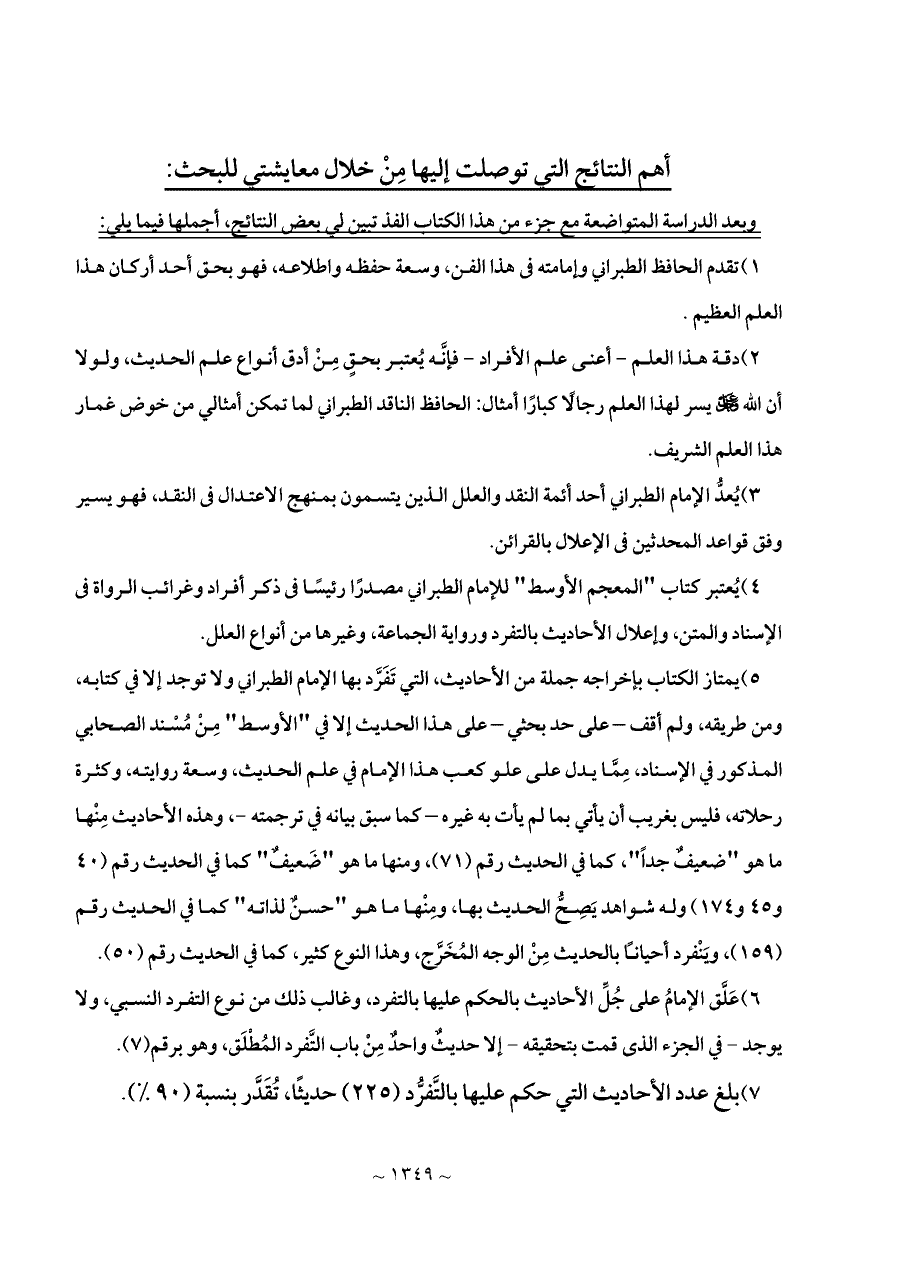 ٢) دقة هذا العلم - أعنى علم الأفراد - فإنَّه يُعتبر بحقٍ مِنْ أدق أنواع علم الحديث، ولولا ... أن الله - عز وجل - يسر لهذا العلم رجالًا كبارًا أمثال: الحافظ الناقد الطبراني لما تمكن أمثالي من خوض غمار هذا العلم الشريف.
