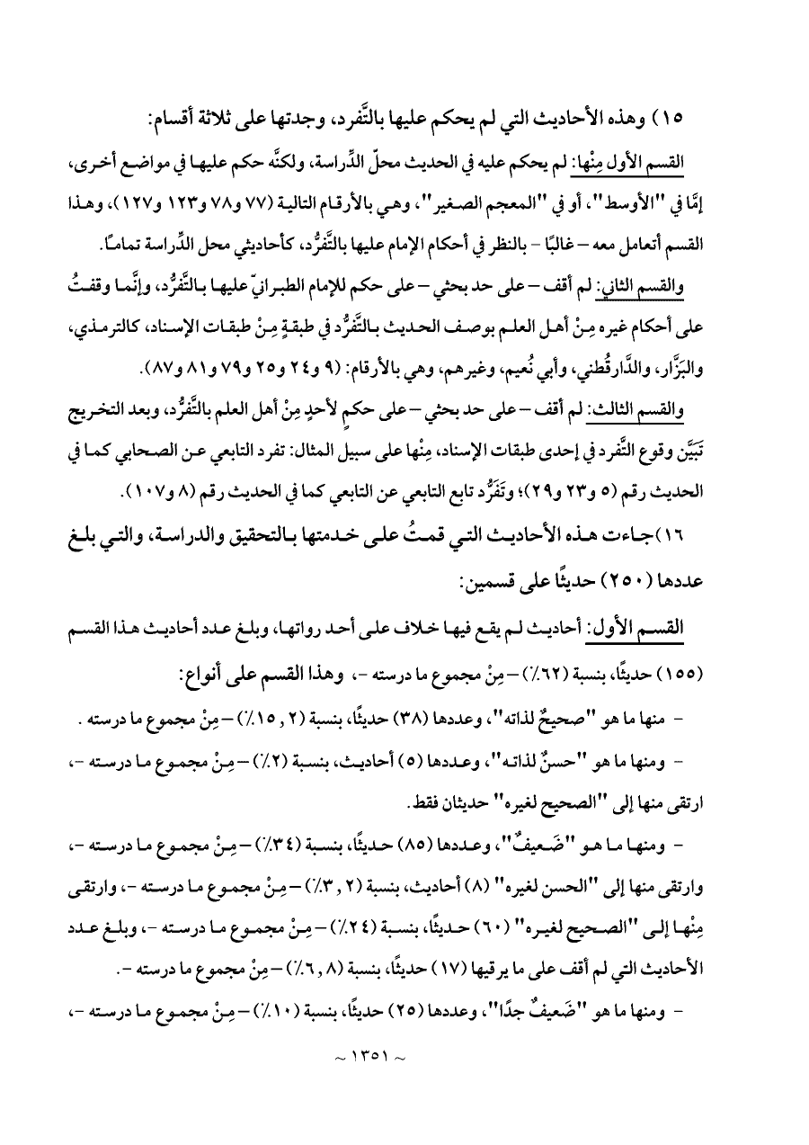 ١٥) وهذه الأحاديث التي لم يحكم عليها بالتَّفرد، وجدتها على ثلاثة أقسام: