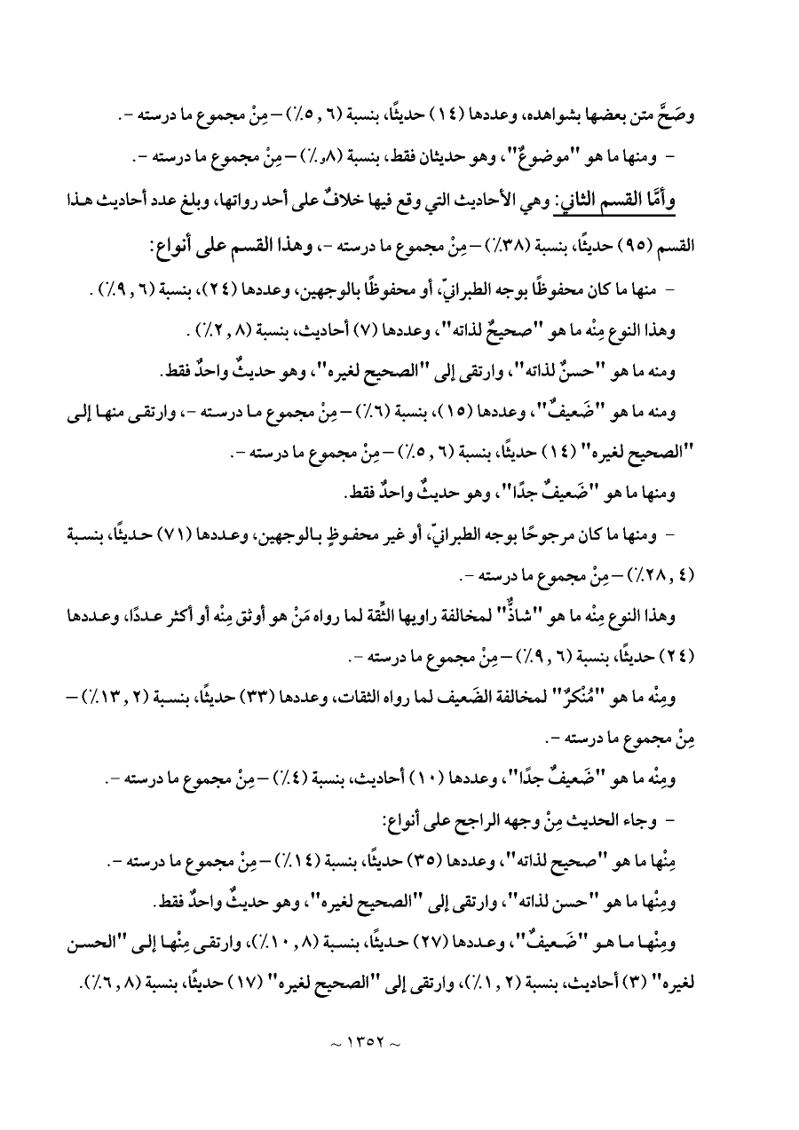 ومنه ما هو "ضَعيفٌ"، وعددها (١٥)، بنسبة (٦%) - مِنْ مجموع ما درسته -، وارتقى منها إلى "الصحيح لغيره" (١٤) حديثًا، بنسبة (٥.٦%) - مِنْ مجموع ما درسته -.