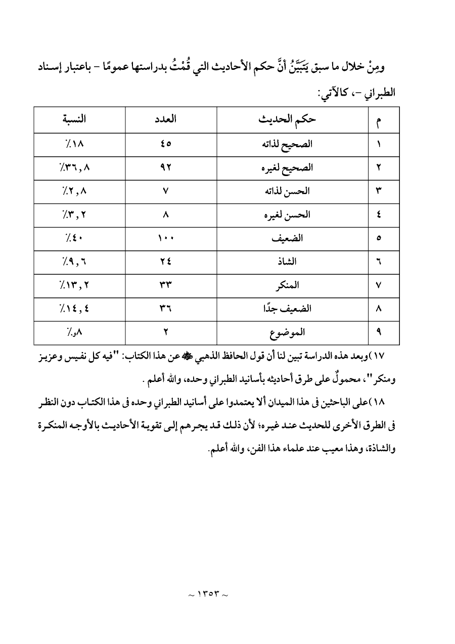١٧) وبعد هذه الدراسة تبين لنا أن قول الحافظ الذهبي - رضي الله عنه - عن هذا الكتاب: "فيه كل نفيس وعزيز ومنكر"، محمولٌ على طرق أحاديثه بأسانيد الطبراني وحده، والله أعلم.