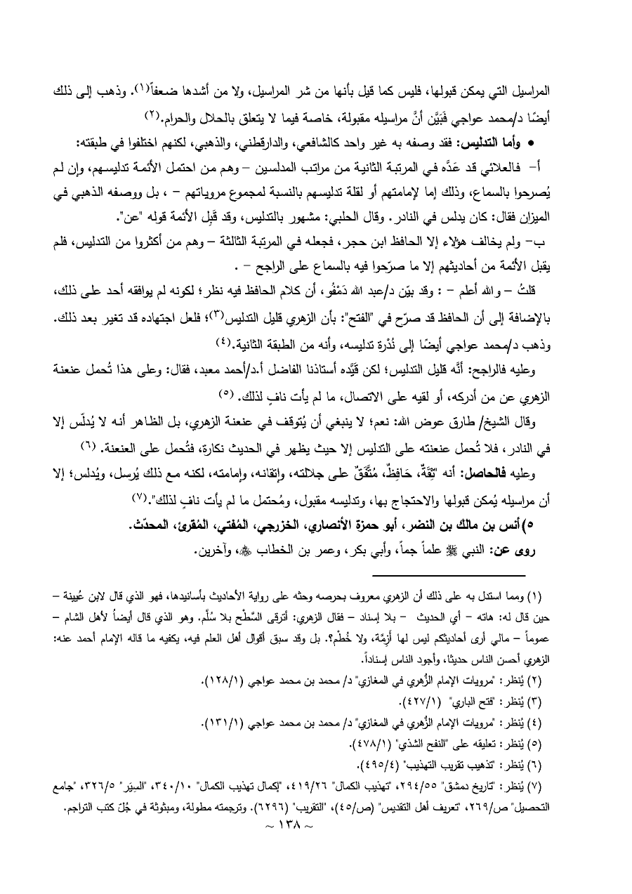 ب ولم يخالف هؤلاء إلا الحافظ ابن حجر، فجعله في المرتبة الثالثة - وهم من أكثروا من التدليس، فلم يقبل الأئمة من أحاديثهم إلا ما صرّحوا فيه بالسماع على الراجح -.