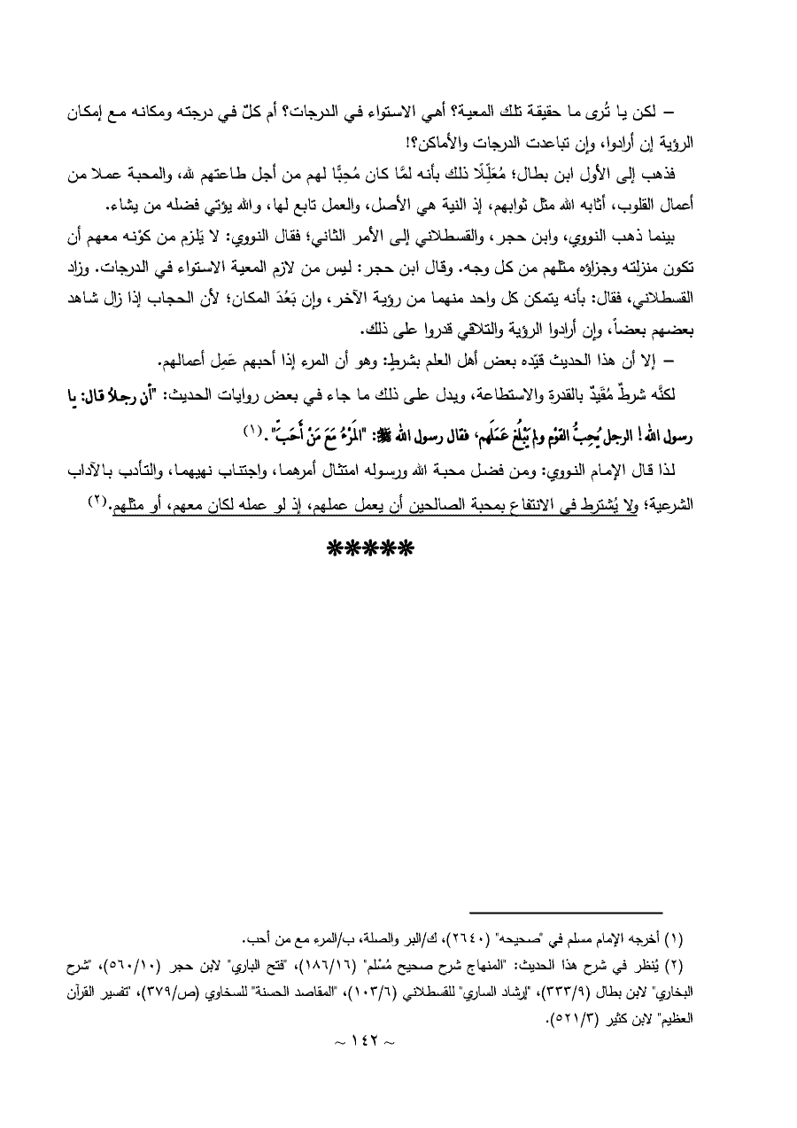 بينما ذهب النووي، وابن حجر، والقسطلاني إلى الأمر الثاني؛ فقال النووي: لا يَلزم من كوْنه معهم أن تكون منزلته وجزاؤه مثلهم من كل وجه. وقال ابن حجر: ليس من لازم المعية الاستواء في الدرجات. وزاد القسطلاني، فقال: بأنه يتمكن كل واحد منهما من رؤية الآخر، وإن بَعُدَ المكان؛ لأن الحجاب إذا زال شاهد بعضهم بعضاً، وإن أرادوا الرؤية والتلاقي قدروا على ذلك.