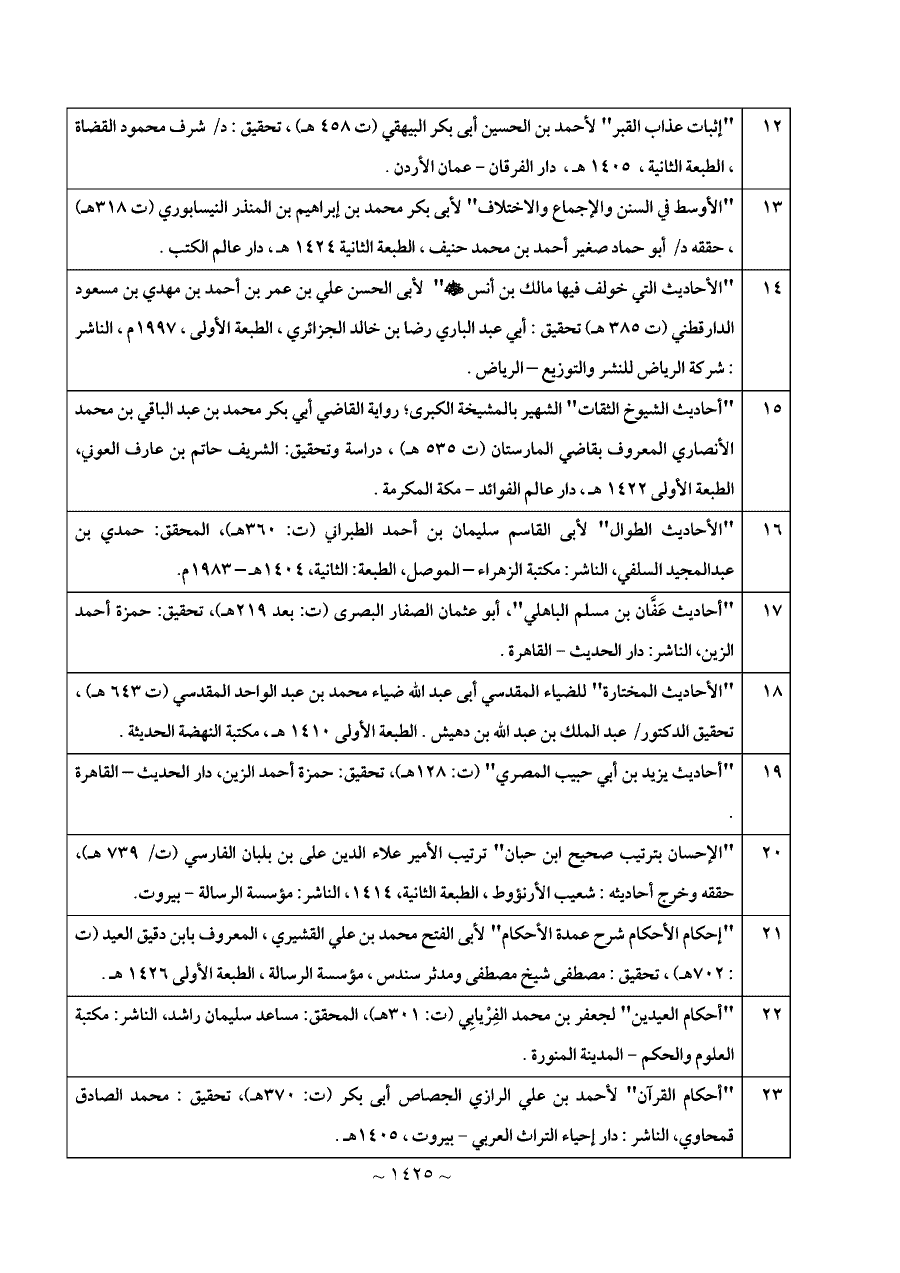 ١٨ - "الأحاديث المختارة" للضياء المقدسي أبى عبد الله ضياء محمد بن عبد الواحد المقدسي (ت ٦٤٣ هـ)، تحقيق الدكتور/ عبد الملك بن عبد الله بن دهيش. الطبعة الأولى ١٤١٠ هـ، مكتبة النهضة الحديثة.