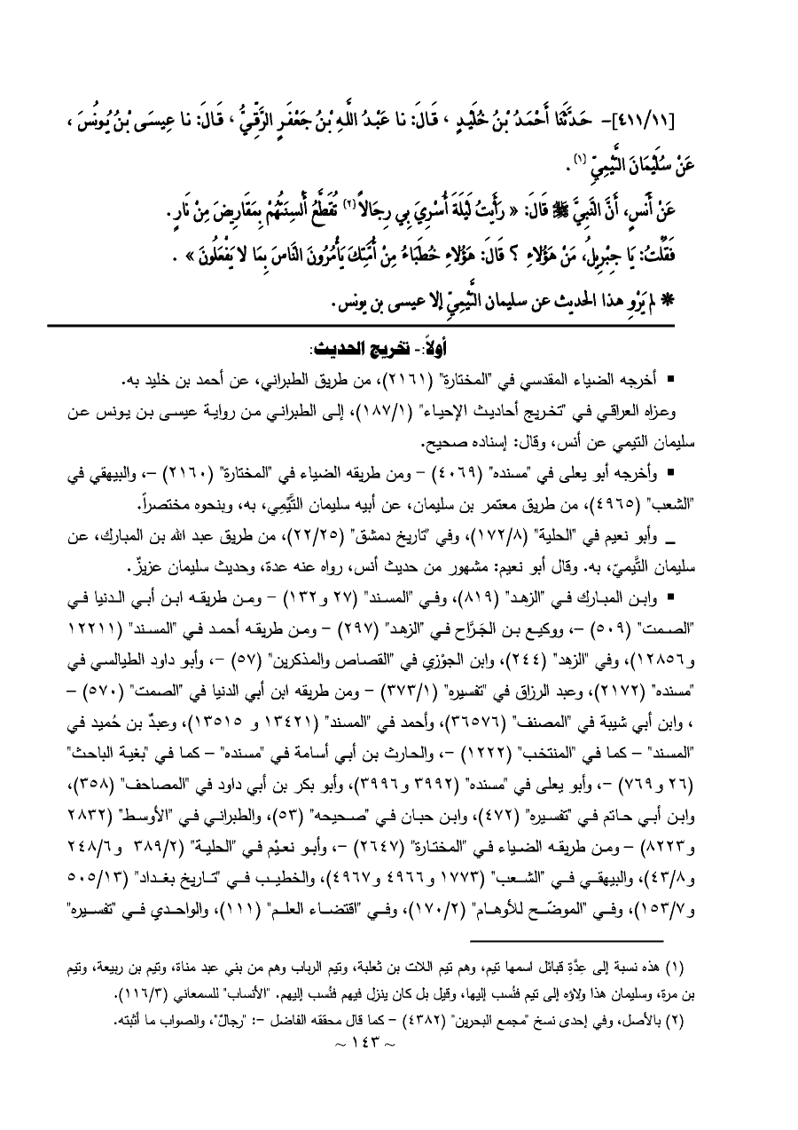 [١١/ ٤١١]- حَدَّثَنَا أَحْمَدُ بْنُ خُلَيْدٍ، قَالَ: نا عَبْدُ اللَّهِ بْنُ جَعْفَرٍ الرَّقِّيُّ، قَالَ: نا عِيسَى بْنُ يُونُسَ، ... عَنْ سُلَيْمَانَ التَّيْمِيِّ (¬١).