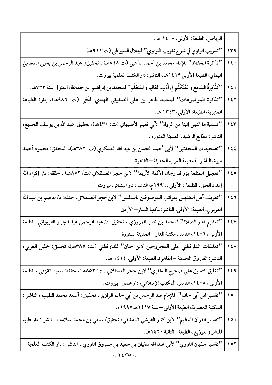 ١٤٦ - "تعريف أهل التقديس بمراتب الموصوفين بالتدليس" لابن حجر العسقلاني، حققه: د/عاصم بن عبد الله القريوني، الطبعة: الأولى، الناشر: مكتبة المنار- الأردن.