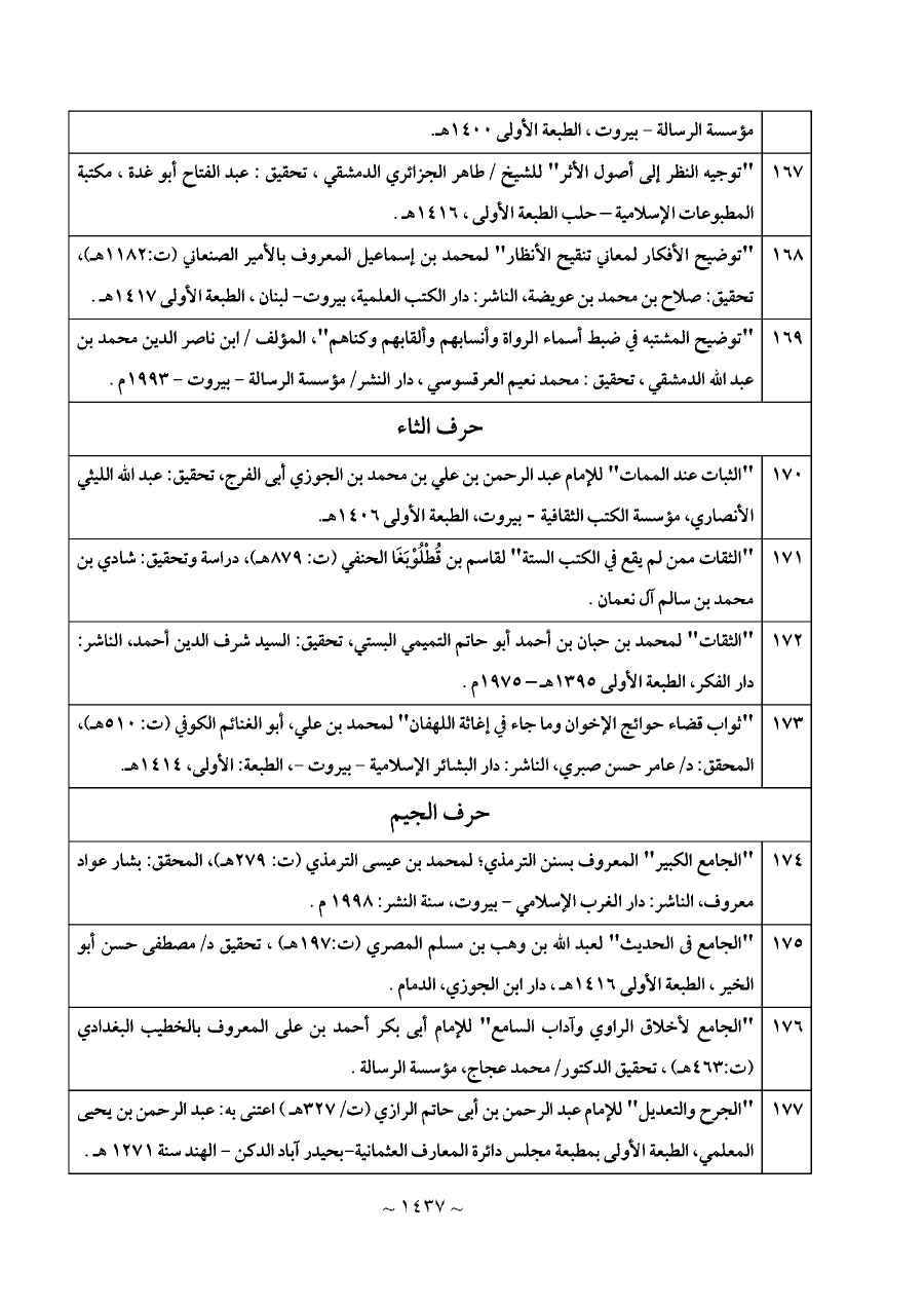 ١٦٩ - "توضيح المشتبه في ضبط أسماء الرواة وأنسابهم وألقابهم وكناهم"، المؤلف /ابن ناصر الدين محمد بن عبد الله الدمشقي، تحقيق: محمد نعيم العرقسوسي، دار النشر/مؤسسة الرسالة - بيروت - ١٩٩٣ م.
